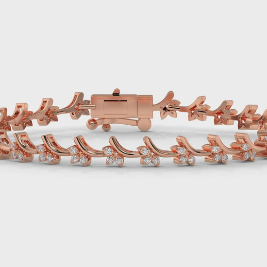 This 0.72 carat total weight diamond bracelet is crafted in 14K rose gold and features sparkling round-cut diamonds arranged in a graceful floral cluster pattern. The elegant design flows beautifully around the wrist, making it a versatile diamond bracelet that can be worn for everyday sophistication or special occasions. With its delicate sparkle and timeless charm, this floral-inspired diamond bracelet is a perfect gift for her or a meaningful addition to your own jewelry collection.