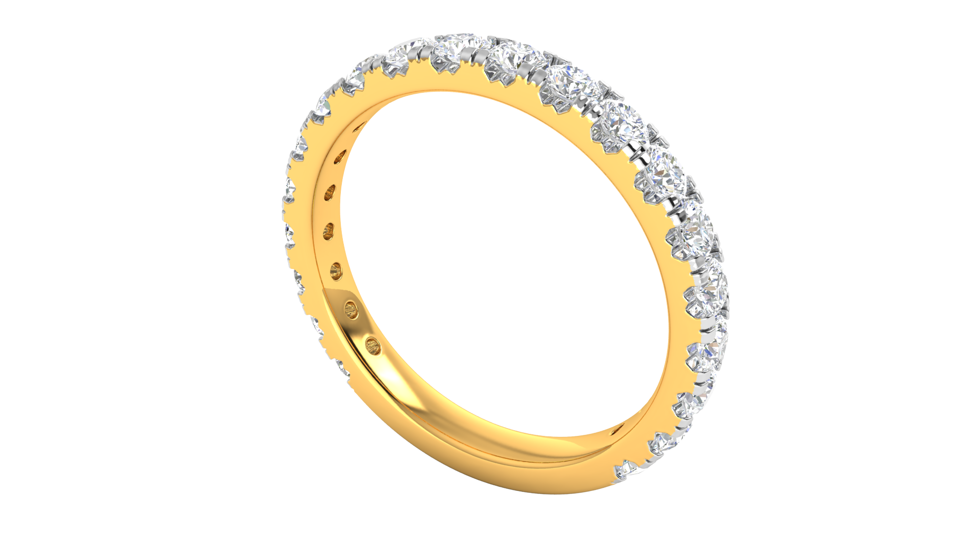Grace your hand with this exquisite 4 prong wedding band, featuring a row of brilliant round-cut diamonds set halfway around the band. Crafted with precision and elegance in yellow gold, this ring offers a perfect balance of sophistication and comfort. The prong setting enhances the sparkle of each diamond, making it an ideal choice for anniversaries, weddings, or special milestones. A timeless piece that symbolizes love and commitment with understated elegance.