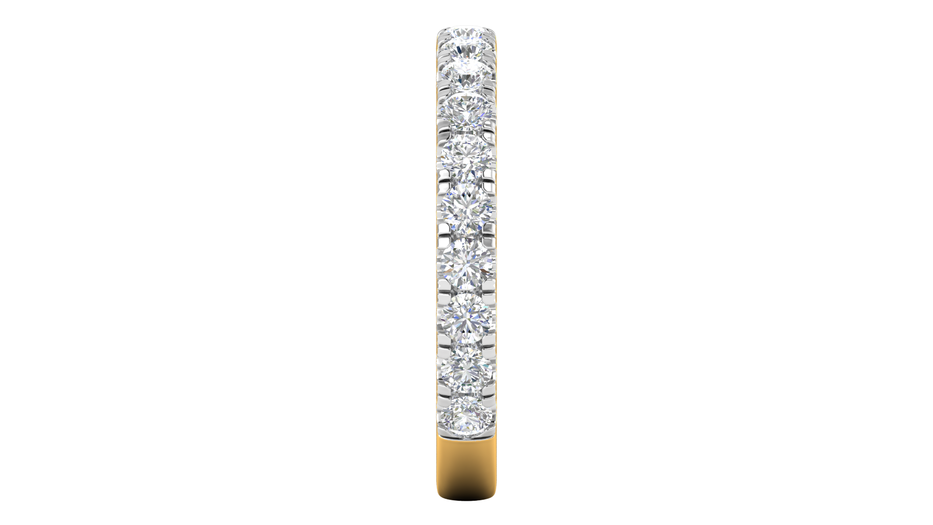 Grace your hand with this exquisite 4 prong wedding band, featuring a row of brilliant round-cut diamonds set halfway around the band. Crafted with precision and elegance in yellow gold,... Show More