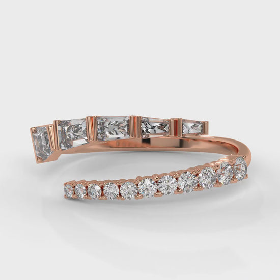 This 1.50 CTW diamond ring in 14K rose gold features a balanced mix of round and tapered baguette diamonds. The wrap-style band brings both shapes together for a bright and... Show More