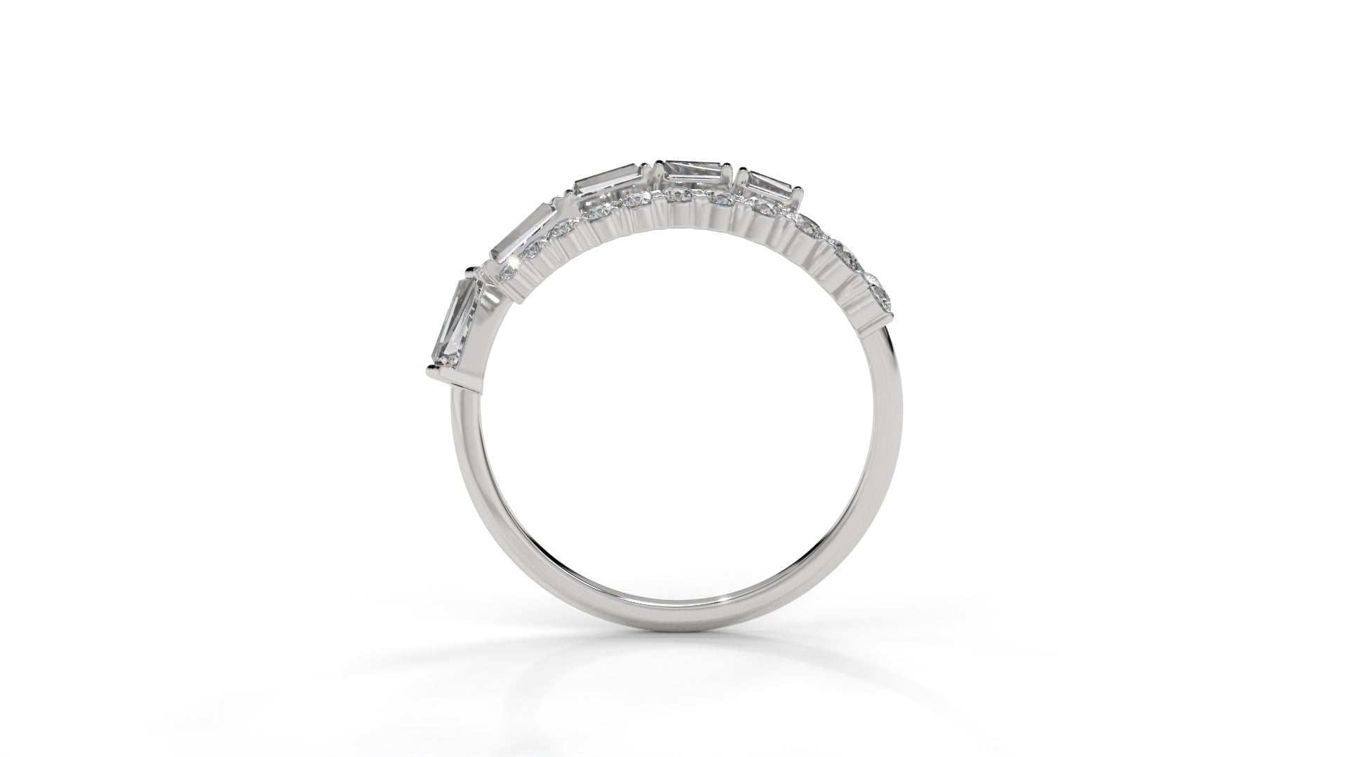 This 1.50 CTW diamond ring in 14K white gold features a balanced mix of round and tapered baguette diamonds. The wrap-style band brings both shapes together for a bright and graceful design that catches the light beautifully. Each diamond is set to create a smooth flow across the band, giving the ring a rich sparkle from every view. The polished white-gold finish enhances the contrast between the round and baguette cuts, making it a versatile piece that looks refined and unique for any style.