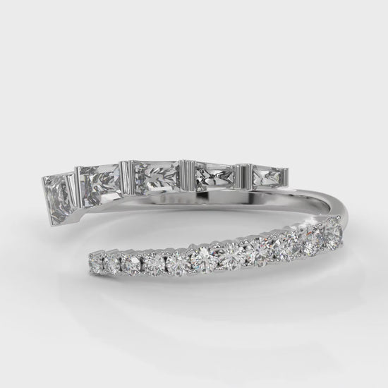 This 1.50 CTW diamond ring in 14K white gold features a balanced mix of round and tapered baguette diamonds. The wrap-style band brings both shapes together for a bright and... Show More