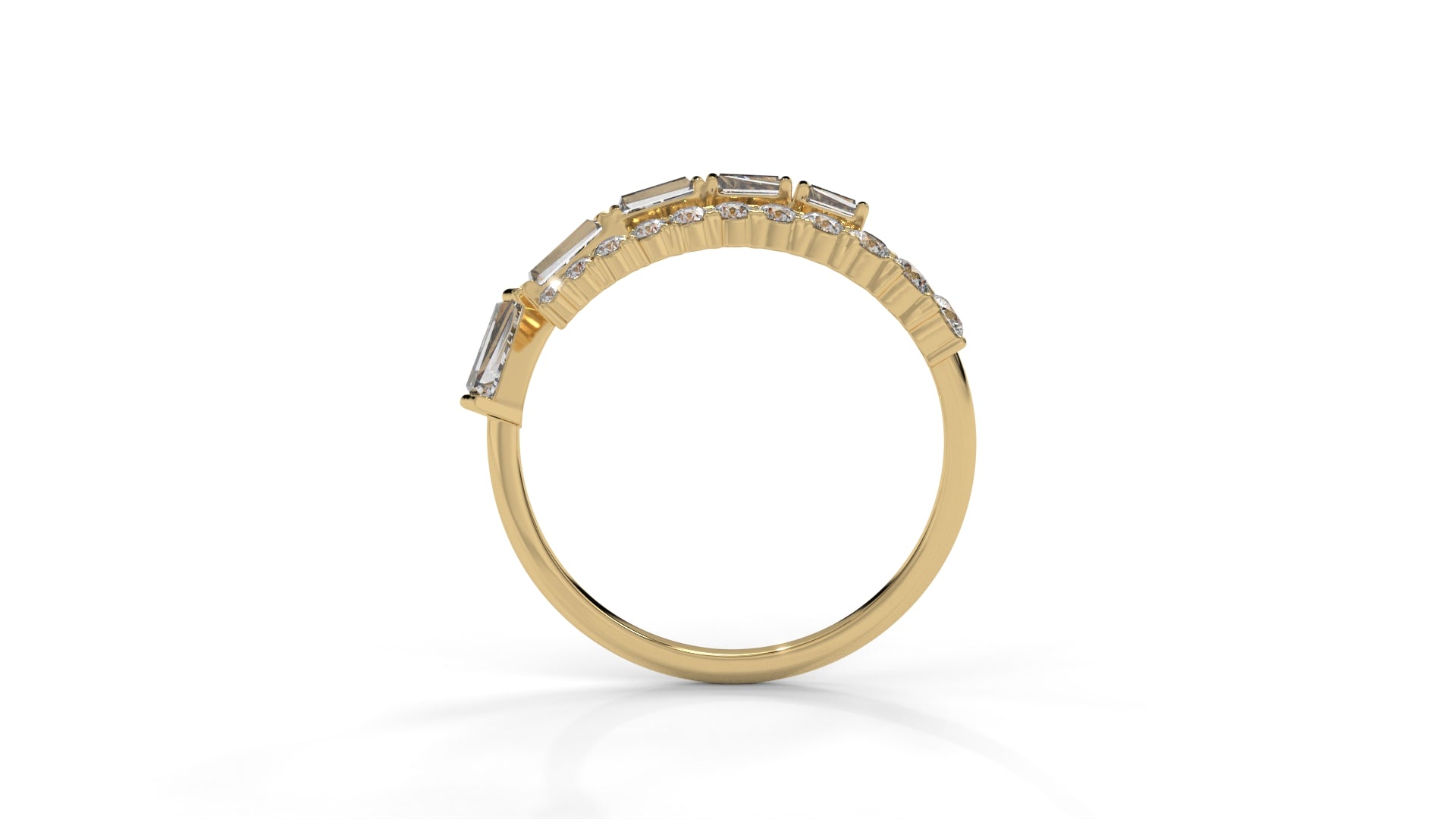 This 1.50 CTW diamond ring in 14K yellow gold features a balanced mix of round and tapered baguette diamonds. The wrap-style band brings both shapes together for a bright and graceful design that catches the light beautifully. Each diamond is set to create a smooth flow across the band, giving the ring a rich sparkle from every view. The polished yellow-gold finish enhances the contrast between the round and baguette cuts, making it a versatile piece that looks refined and unique for any style.