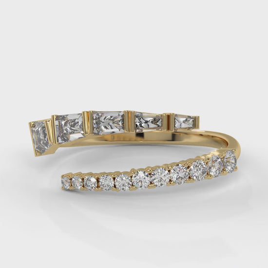 This 1.50 CTW diamond ring in 14K yellow gold features a balanced mix of round and tapered baguette diamonds. The wrap-style band brings both shapes together for a bright and... Show More