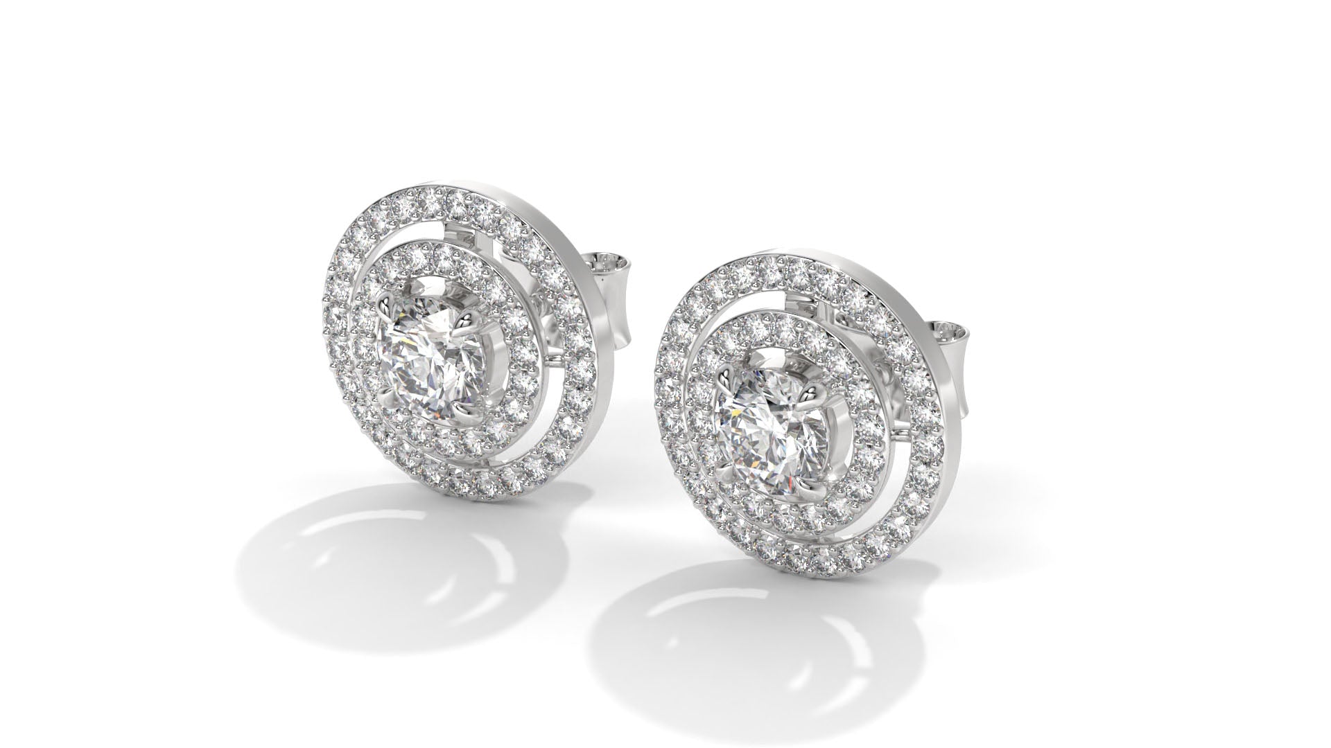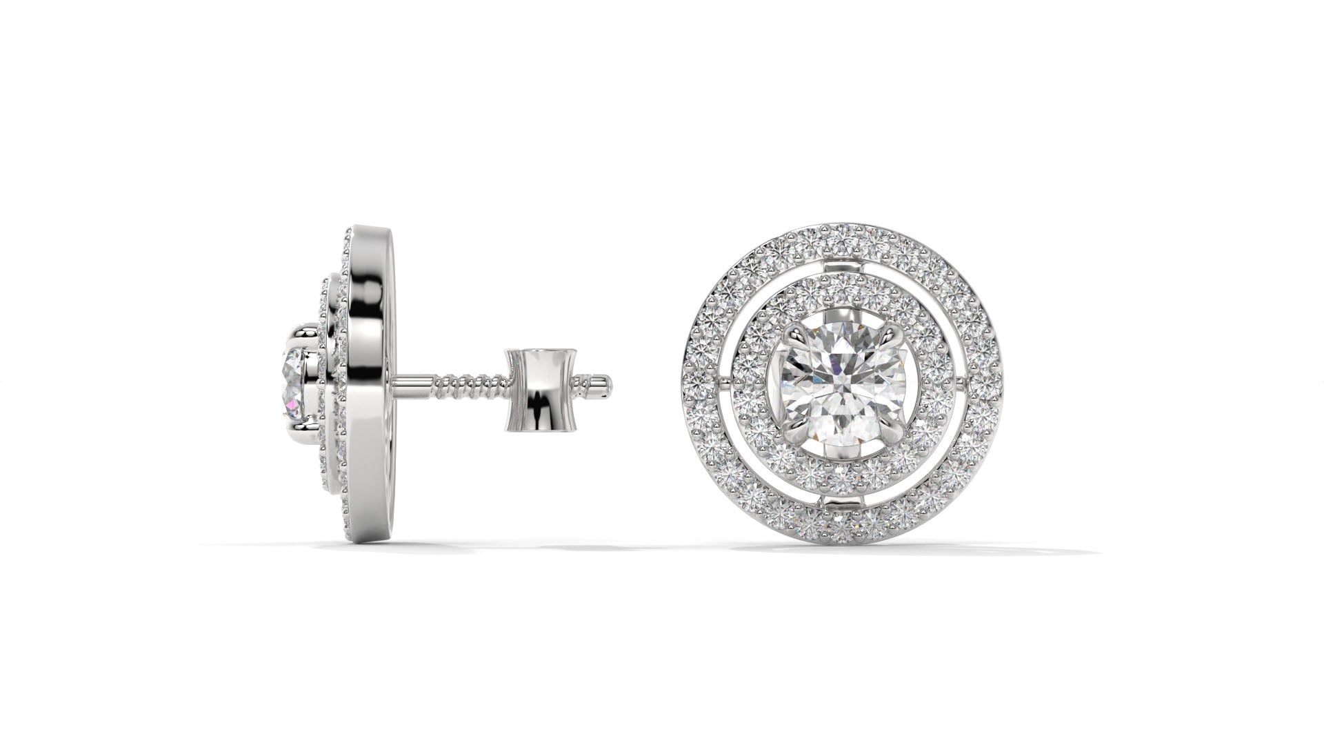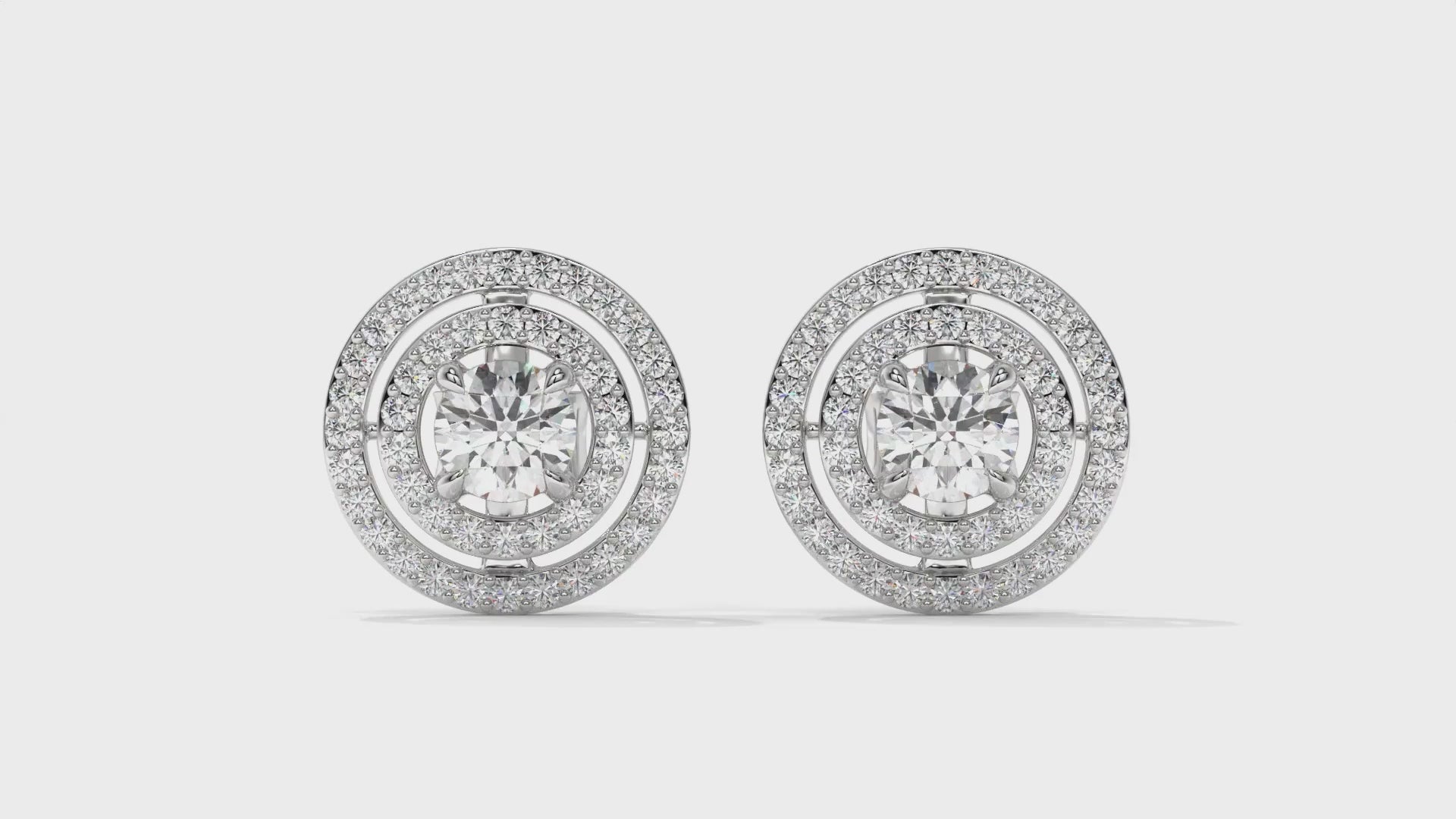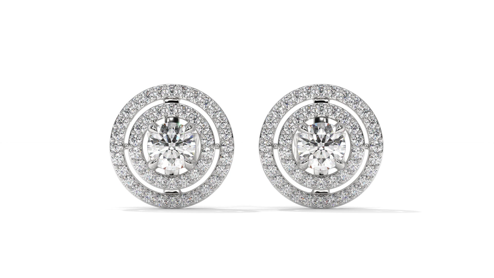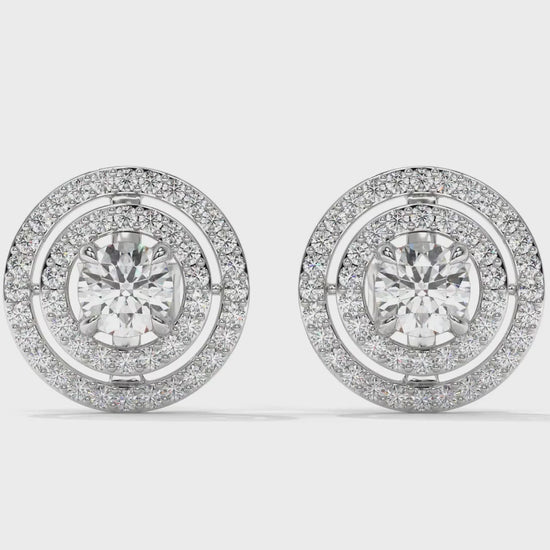 Featuring a total weight of 1.92 carats, these 14K white gold stud earrings showcase brilliant round center diamonds surrounded by a double halo of smaller accent stones. The layered halo design enhances the sparkle and gives these studs a bold, elegant look, perfect for both everyday luxury and special occasions.