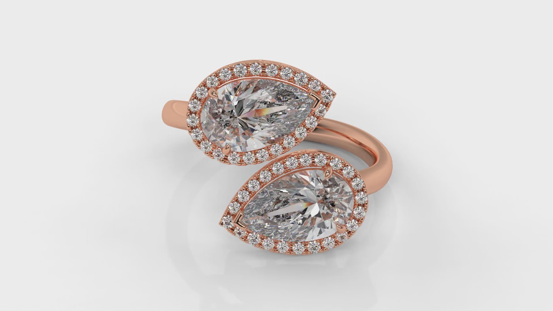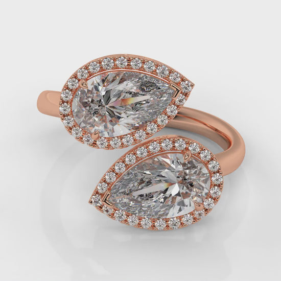 This 1.95 CTW Toi et Moi diamond ring in 14K Rose gold features two pear-shape center diamonds surrounded by a halo of round-cut accent diamonds. The halo setting adds extra sparkle, giving the ring a bright and balanced appearance. The two-stone design represents connection and unity, while the smooth Rose-gold band brings a clean and polished finish. Each diamond is set to reflect light beautifully, creating a look that stands out with brilliance and symmetry. This Toi et Moi ring blends classic beauty with a distinctive design that feels both special and refined.