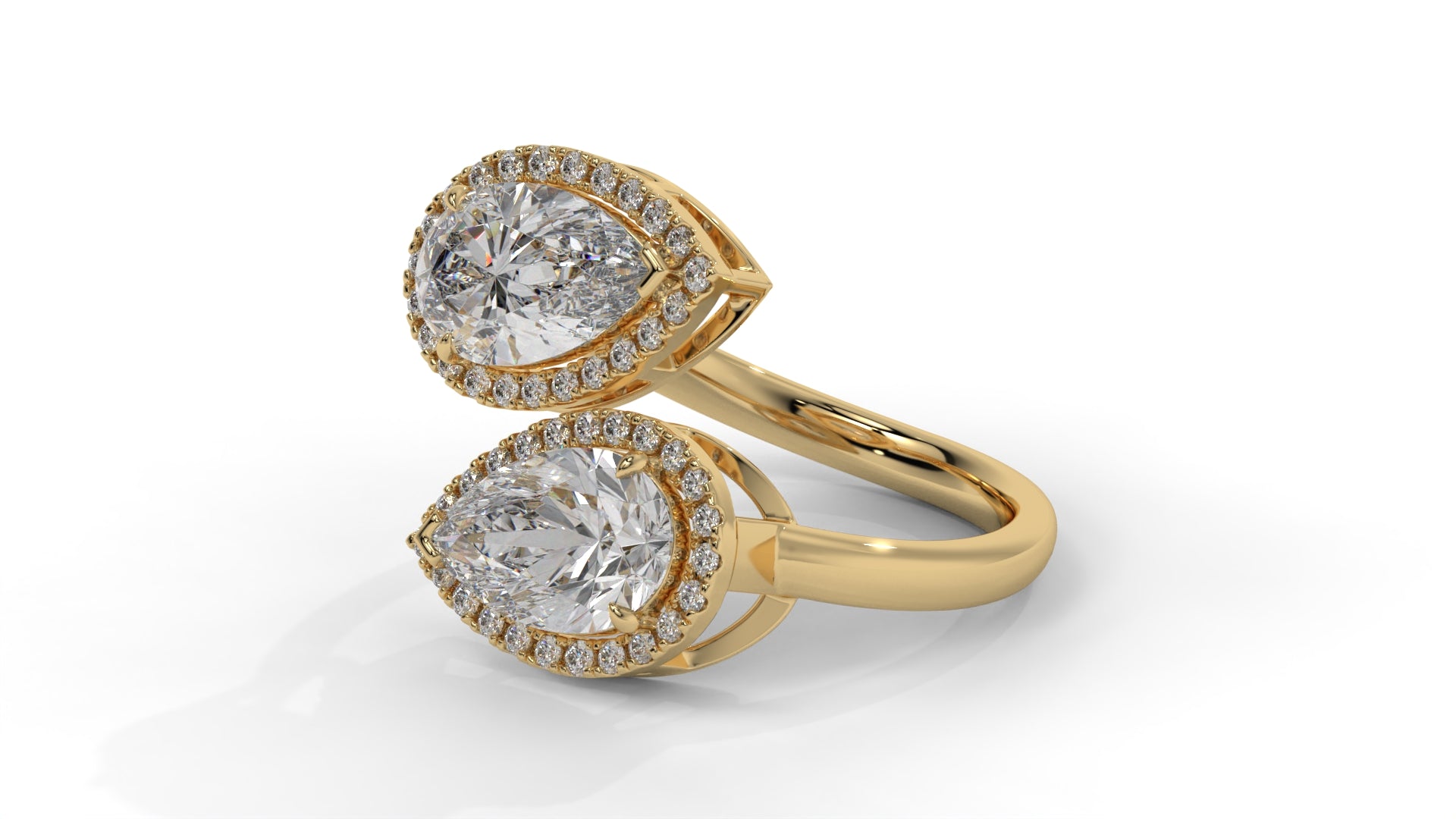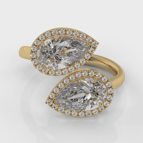 This 1.95 CTW Toi et Moi diamond ring in 14K Yellow gold features two pear-shape center diamonds surrounded by a halo of round-cut accent diamonds. The halo setting adds extra sparkle, giving the ring a bright and balanced appearance. The two-stone design represents connection and unity, while the smooth Yellow-gold band brings a clean and polished finish. Each diamond is set to reflect light beautifully, creating a look that stands out with brilliance and symmetry. This Toi et Moi ring blends classic beauty with a distinctive design that feels both special and refined.