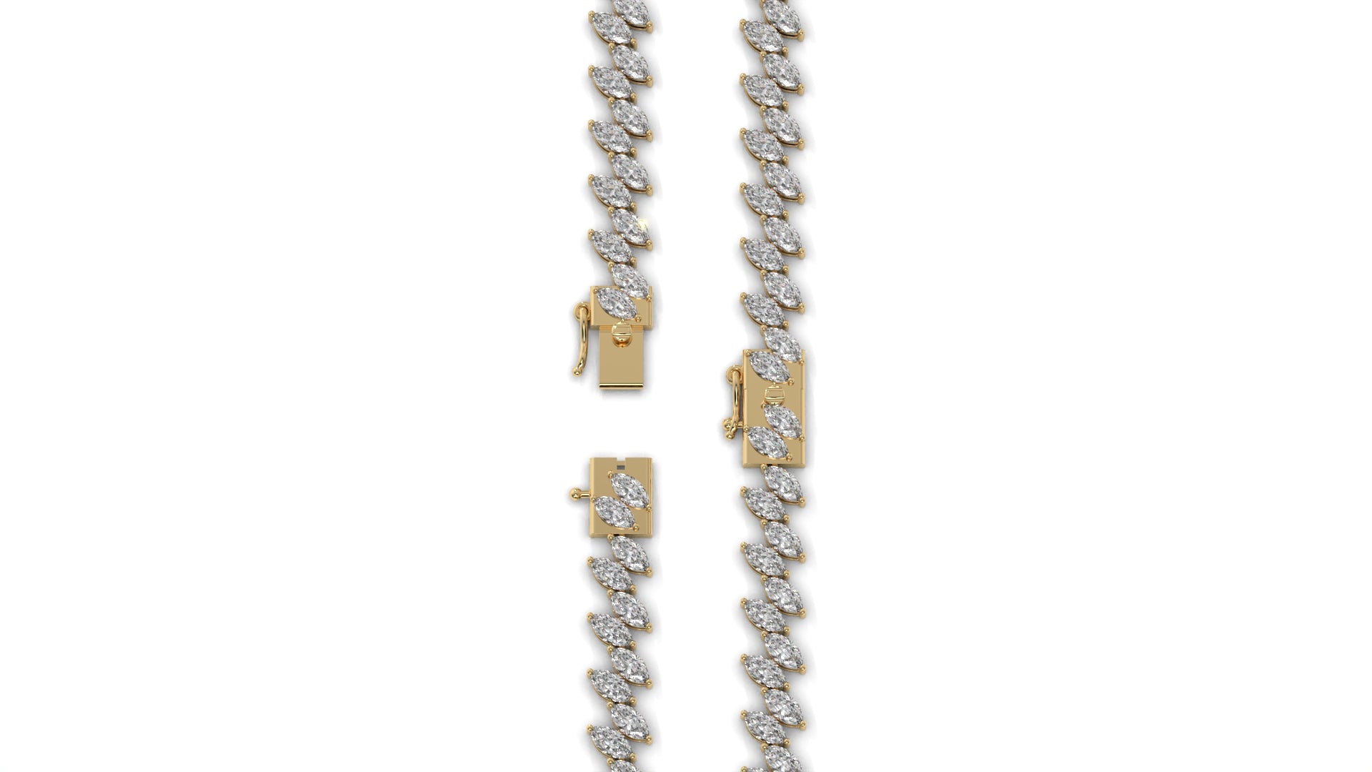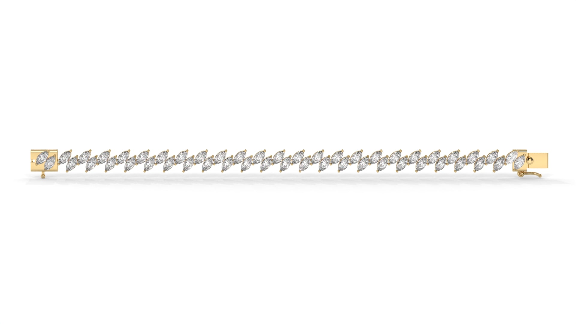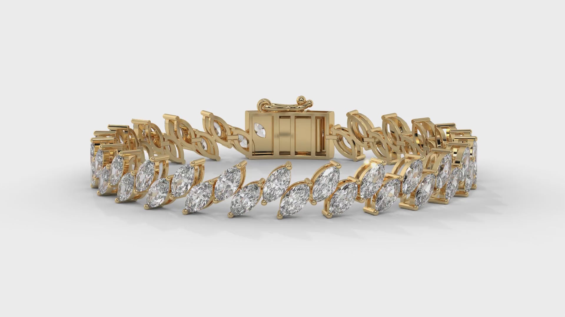 This 12.50 carat total weight diamond bracelet is crafted in 14K yellow gold and features a bold double-row of marquise-cut diamonds. The elongated marquise shape enhances brilliance and creates a fluid, elegant look around the wrist. Designed to stand out, this diamond bracelet makes the perfect statement piece for luxury events, milestone celebrations, or as a timeless addition to your fine jewelry collection.