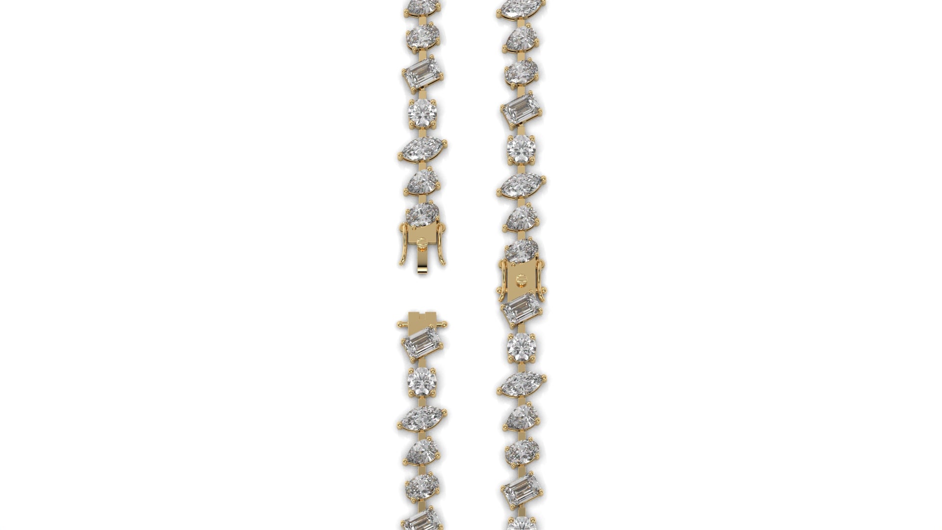 This 12.50 carat total weight diamond bracelet is crafted in 14K Yellow gold and showcases a stunning mix of diamond cuts, including round, emerald, oval, pear, and marquise shapes. The... Show More