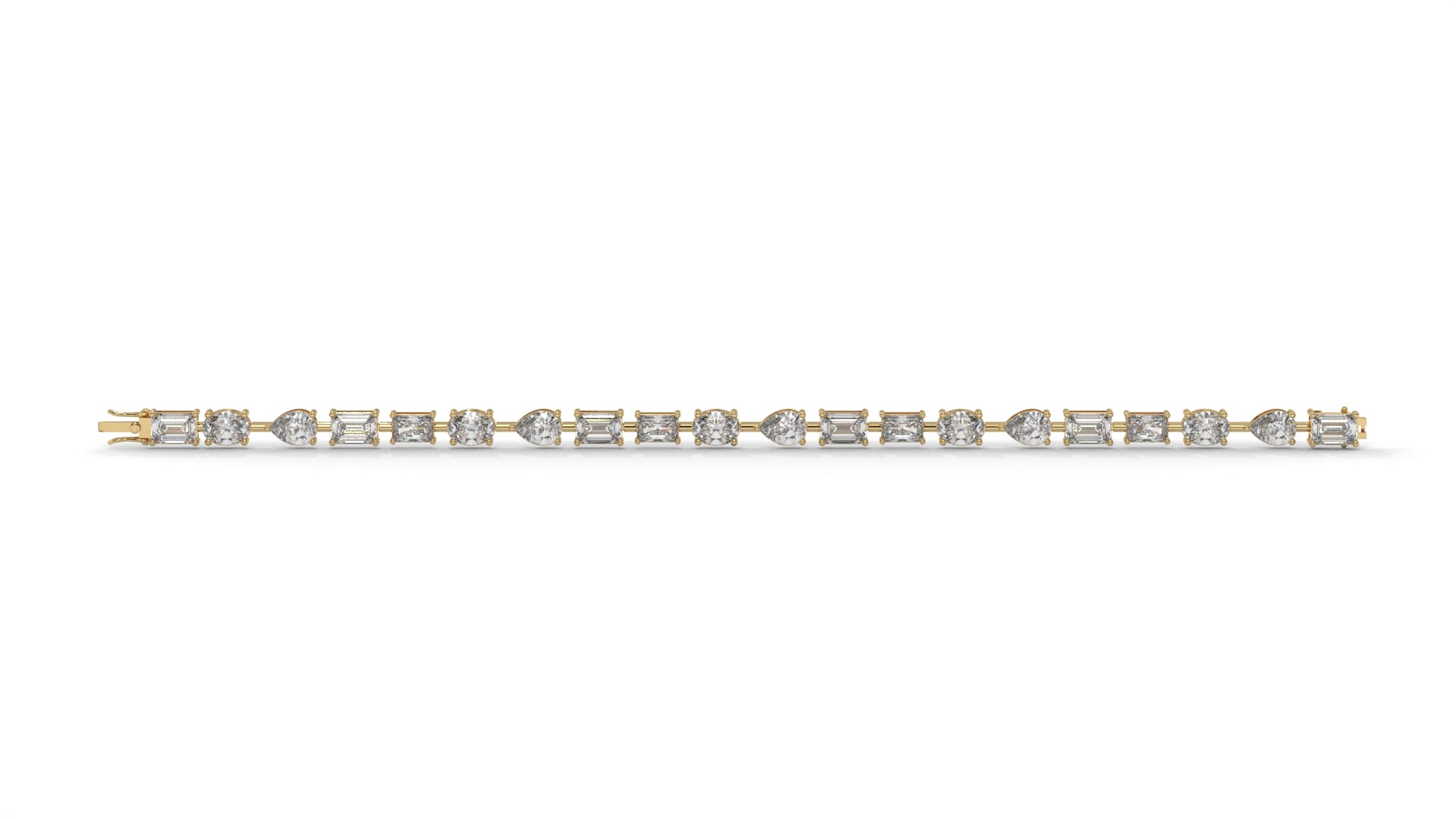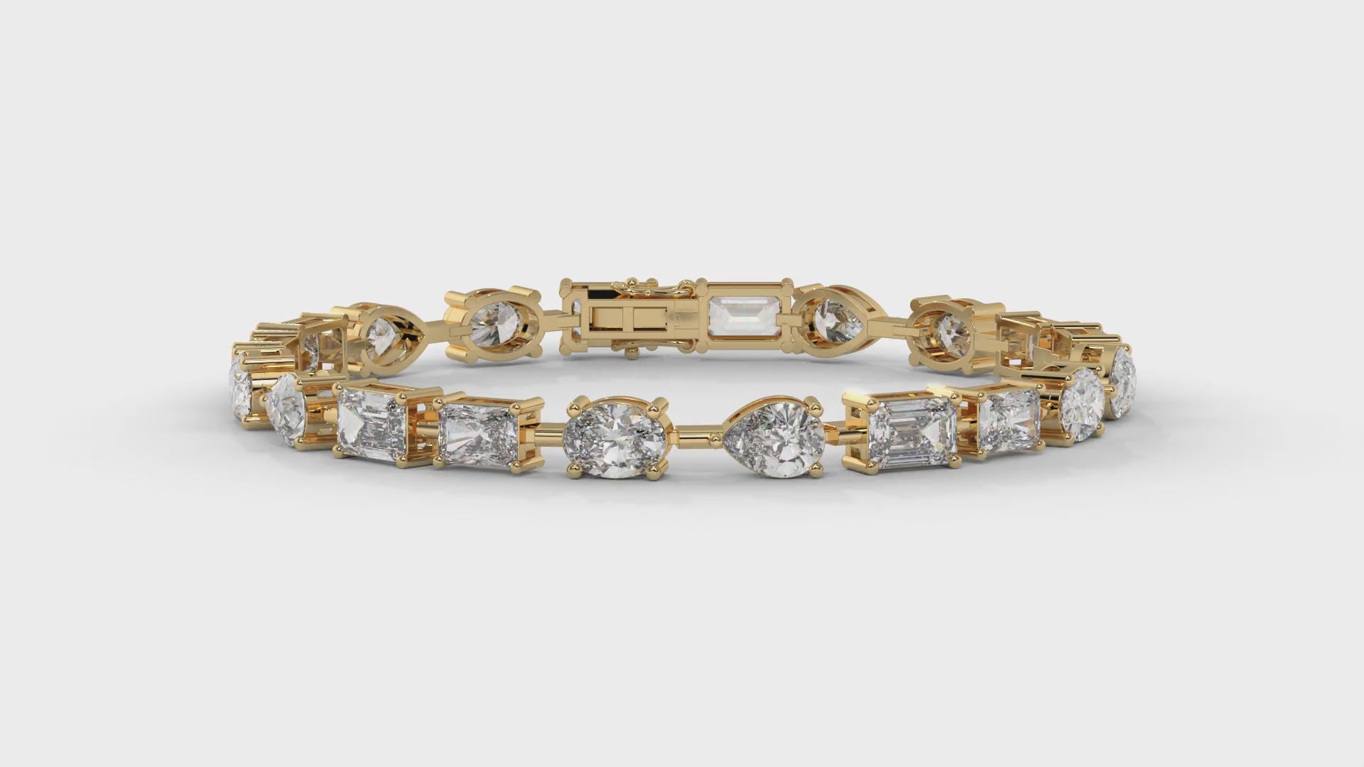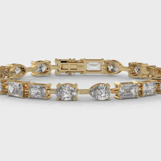 This 13.75 carat total weight diamond bracelet is crafted in 14K yellow gold and features a stunning mix of radiant, emerald, pear, and oval-cut diamonds. The alternating cuts create a modern yet timeless design, with each diamond expertly set to maximize brilliance and sparkle.