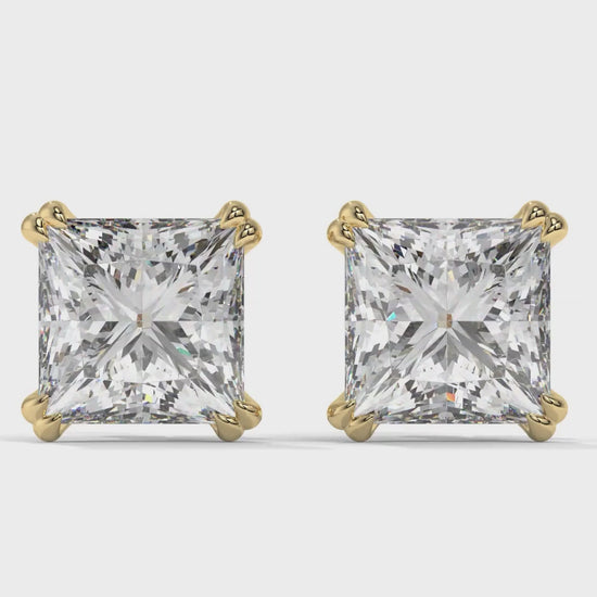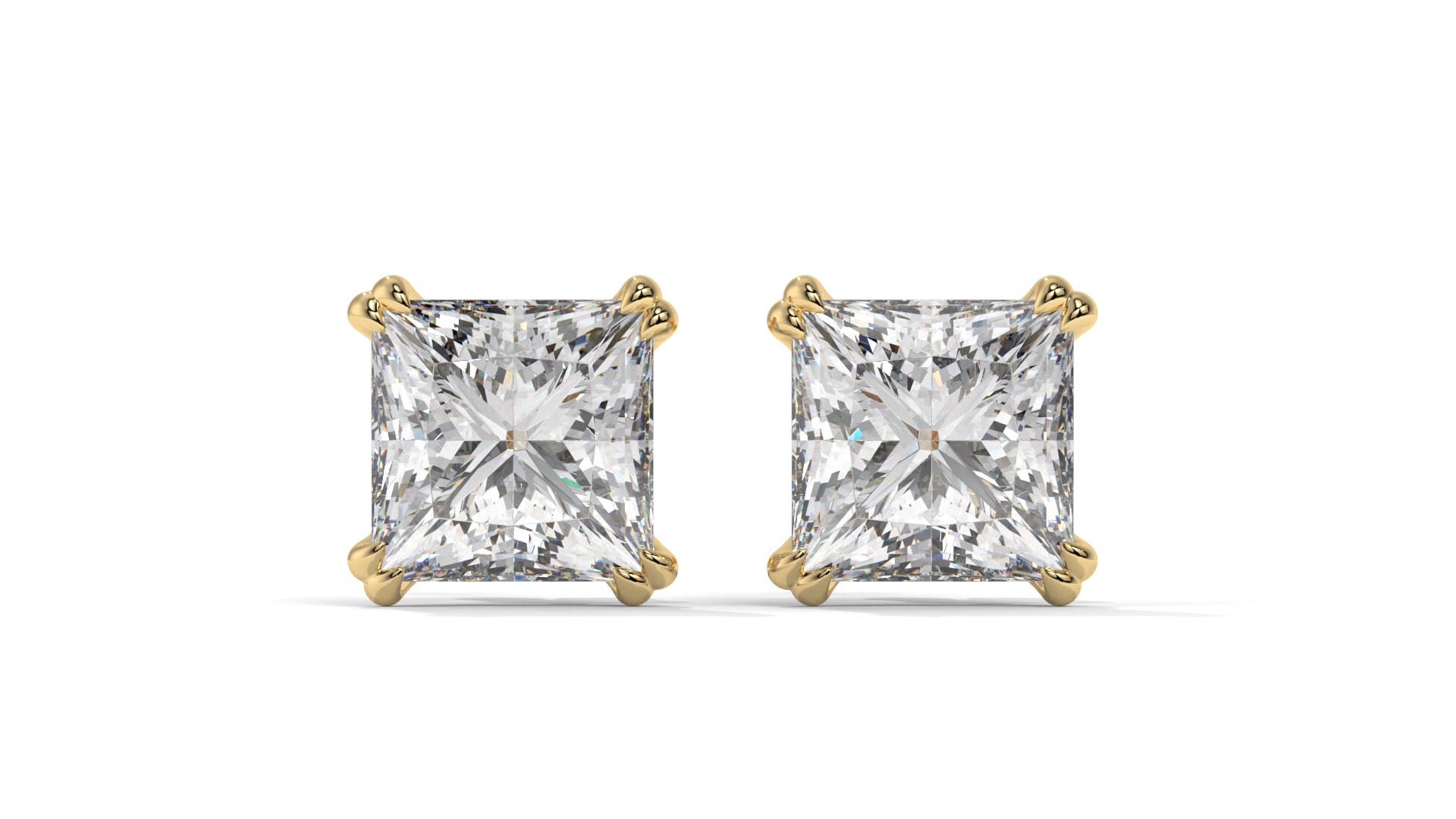 Modern and striking, these 14K yellow gold diamond stud earrings feature a total of 3 carats of brilliant princess-cut diamonds. Set in a secure four-prong design, the warm blush hue of rose gold enhances the clean lines and sparkle of the square-cut stones. Perfect for adding a contemporary touch to everyday style or special occasions.