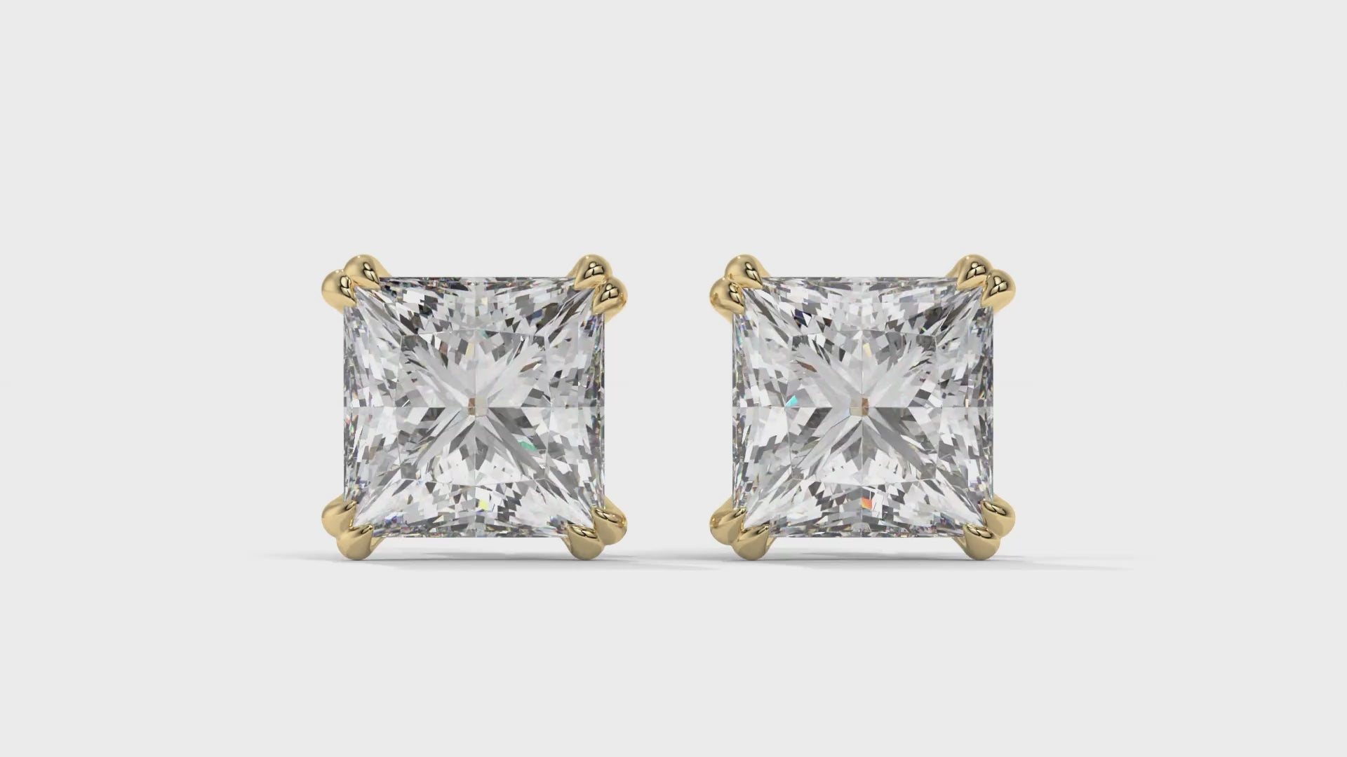Modern and striking, these 14K yellow gold diamond stud earrings feature a total of 3 carats of brilliant princess-cut diamonds. Set in a secure four-prong design, the warm blush hue... Show More