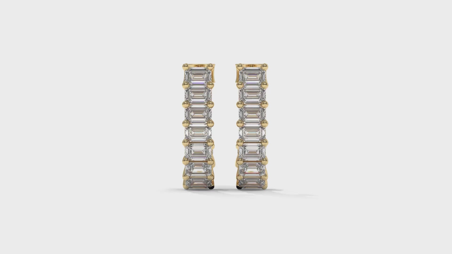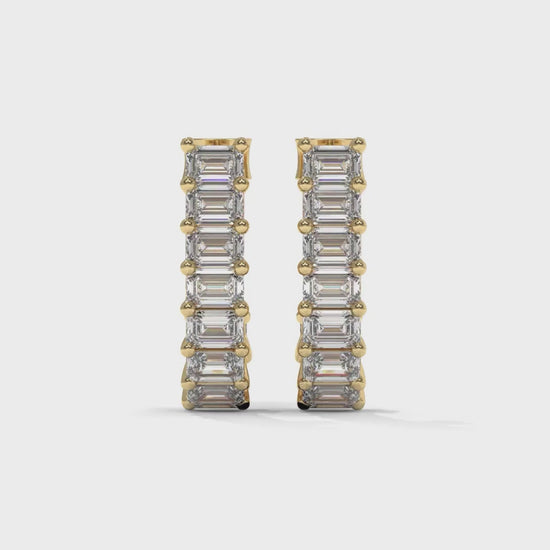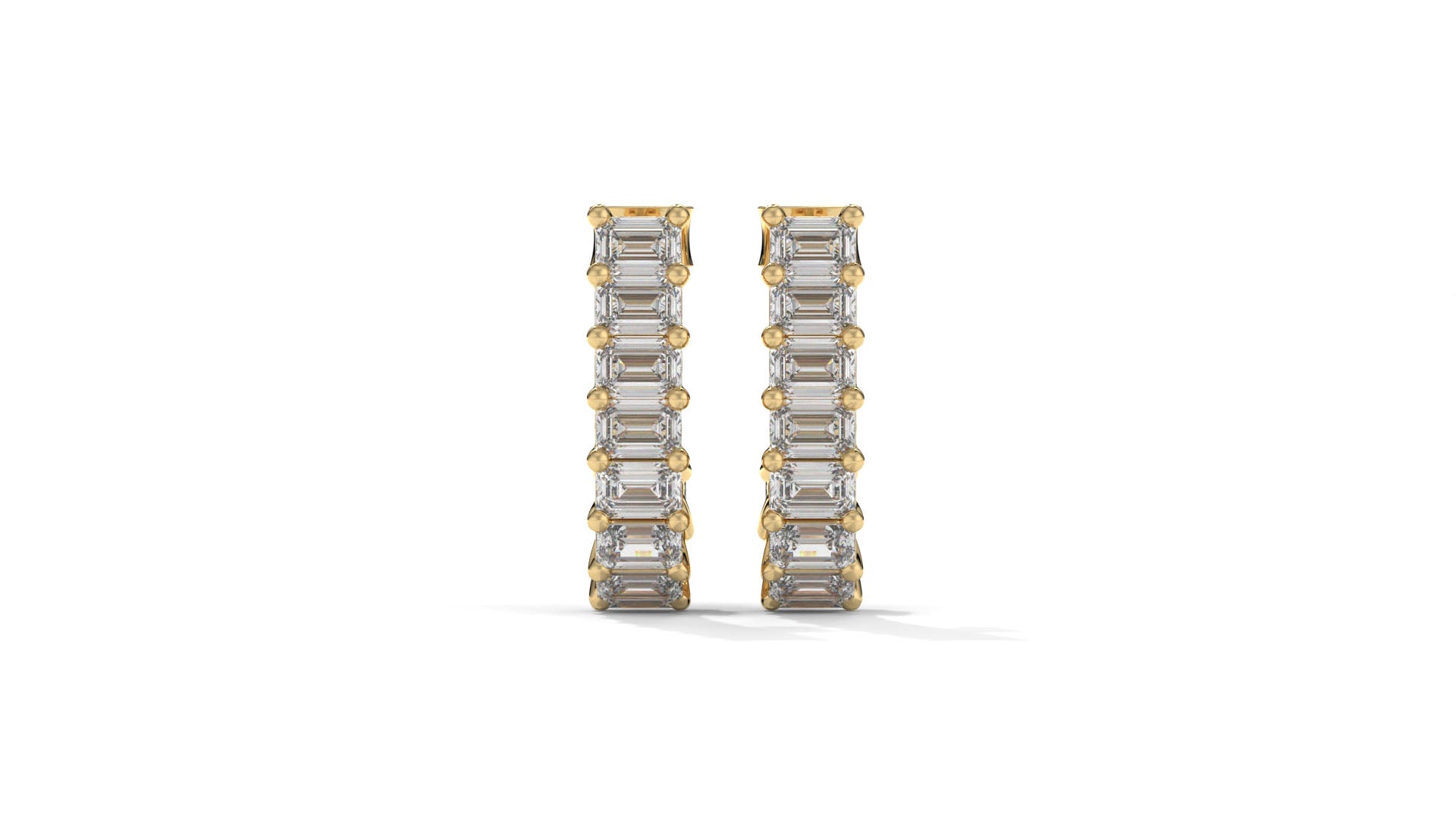 Featuring a total weight of 2.20 carats, these 14K Yellow gold hoop earrings showcase a row of perfectly matched emerald-cut diamonds in a sleek, modern U-shaped design. The step-cut facets of the emerald diamonds create a refined, mirror-like brilliance, making these hoops ideal for both sophisticated everyday wear and elegant evening occasions.