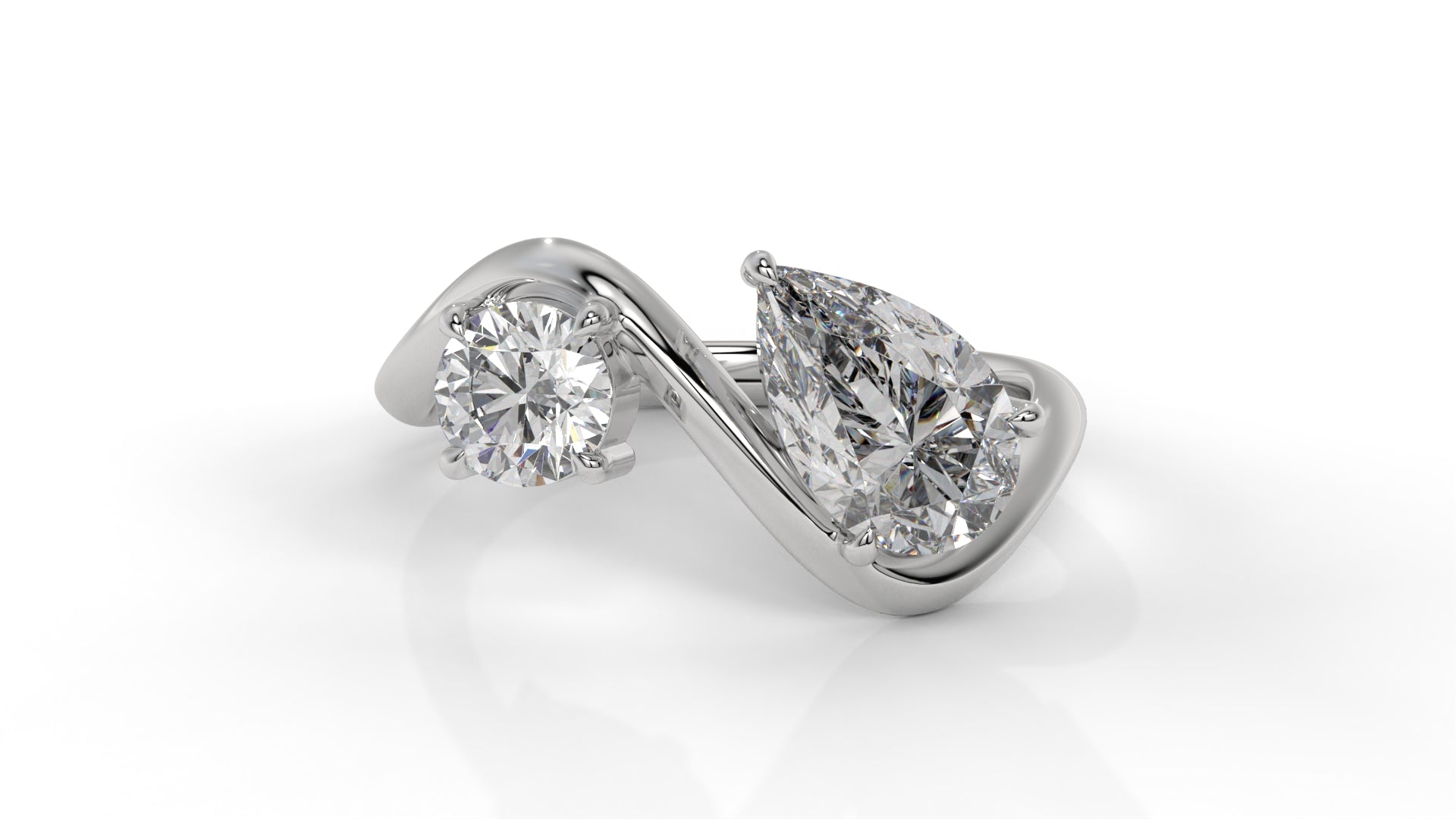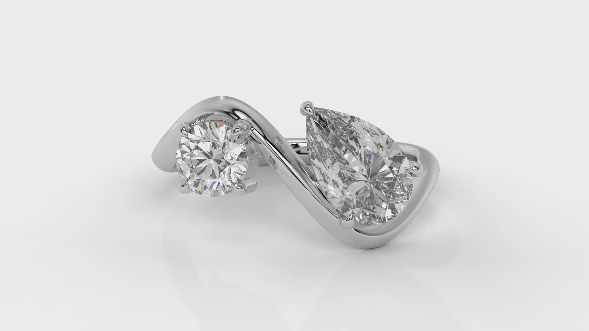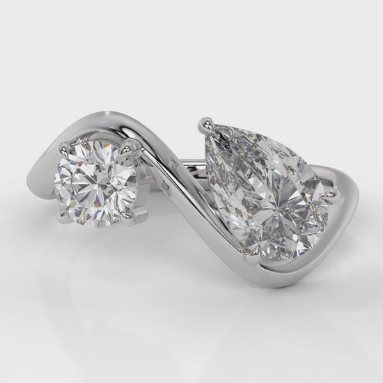 This 2.21 CTW Toi et Moi diamond ring in 14K white gold features two stunning center stones, a round-cut diamond and a pear-shaped diamond. The open crossover band connects both... Show More