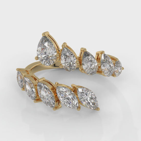 This 2.46 CTW diamond ring in 14K yellow gold features an elegant mix of pear and marquise-shaped diamonds. The open wrap design highlights each diamond beautifully, creating a bright and balanced sparkle from every angle. The pear and marquise cuts flow smoothly across the band, giving the ring a bold yet graceful look. Made in polished 14K yellow gold, this piece stands out with its brilliant shine and refined detail. It’s a statement ring that pairs perfectly with both classic and contemporary jewelry styles.