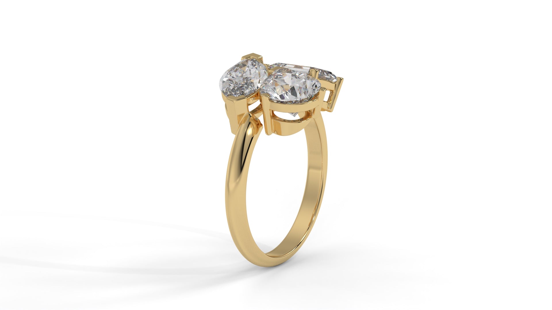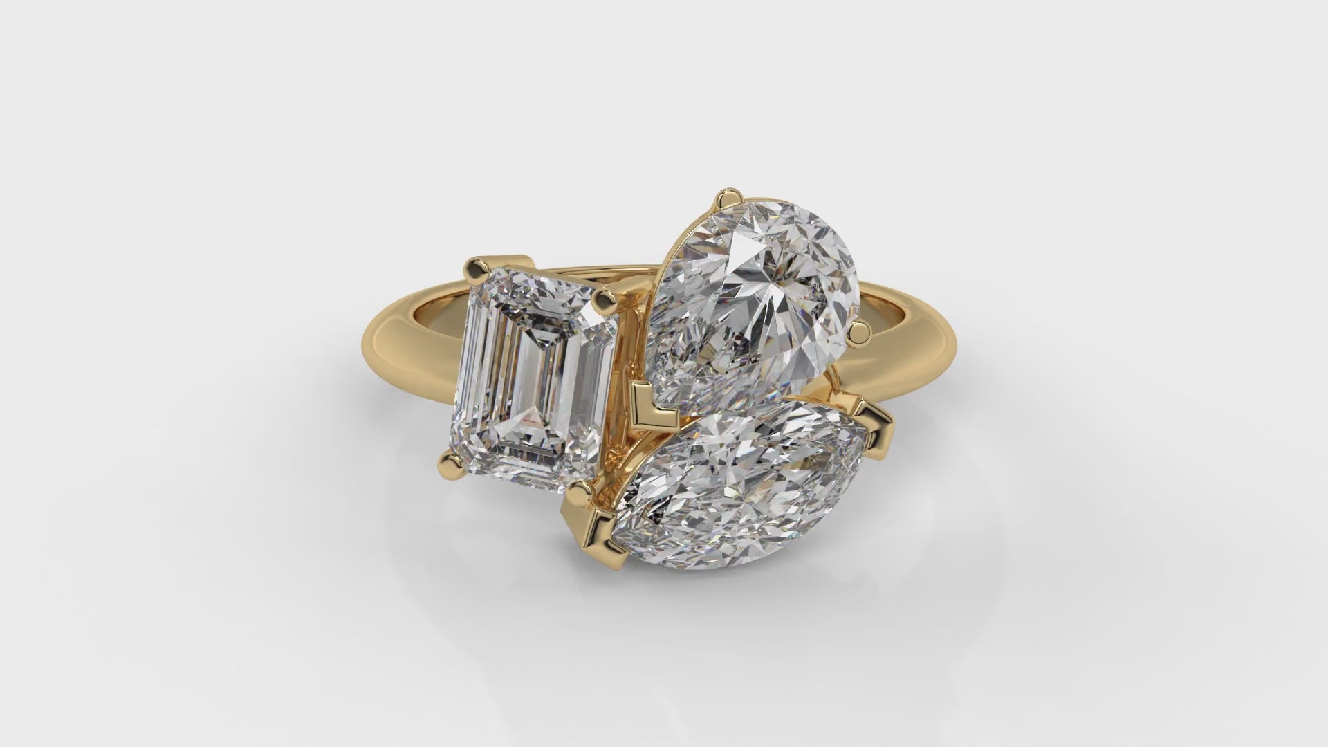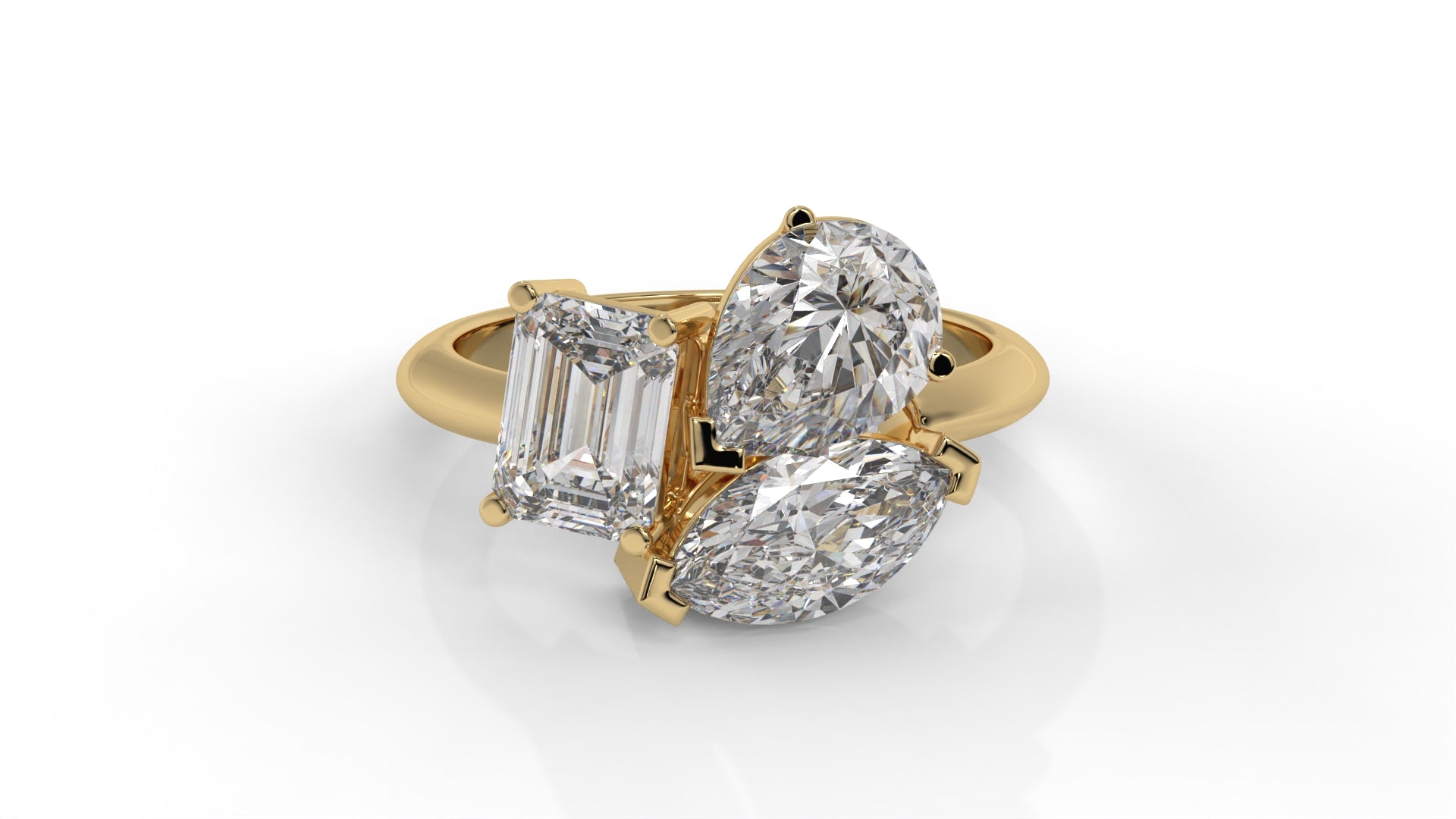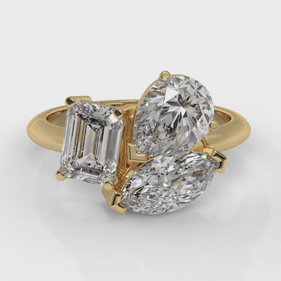 This 3.00 CTW three-stone Toi et Moi diamond ring in 14K yellow gold features a unique blend of pear, emerald, and marquise-cut diamonds. The three-stone layout brings together distinct shapes that complement one another, creating a balanced and bright look from every angle. Each diamond is hand-set to show off its clarity and fire, while the polished yellow-gold band adds a sleek finish. The design represents connection and individuality, making it a standout choice for those who love statement jewelry with meaning.