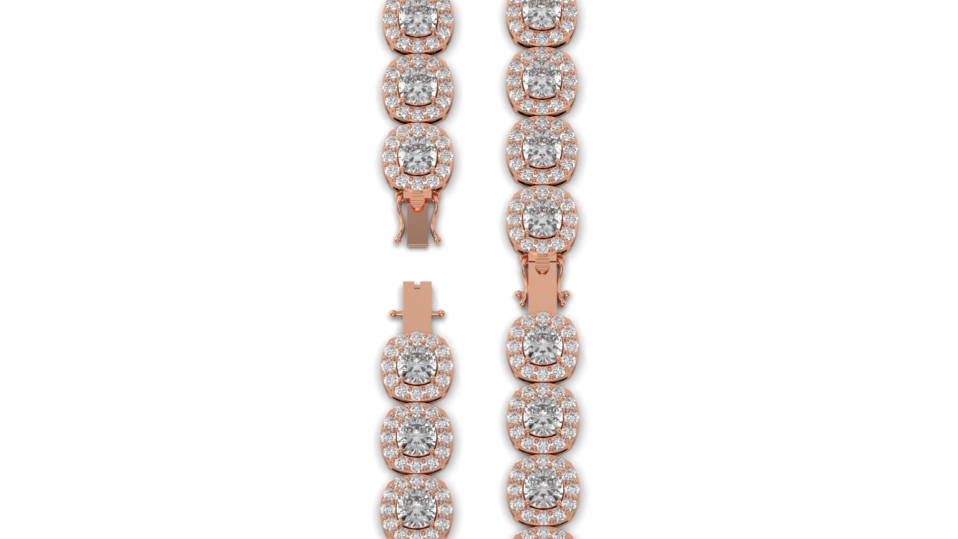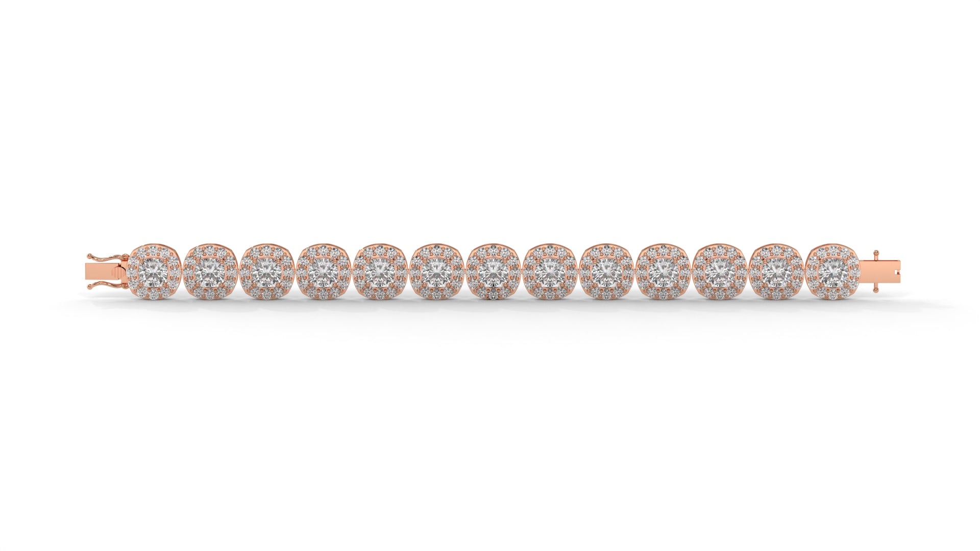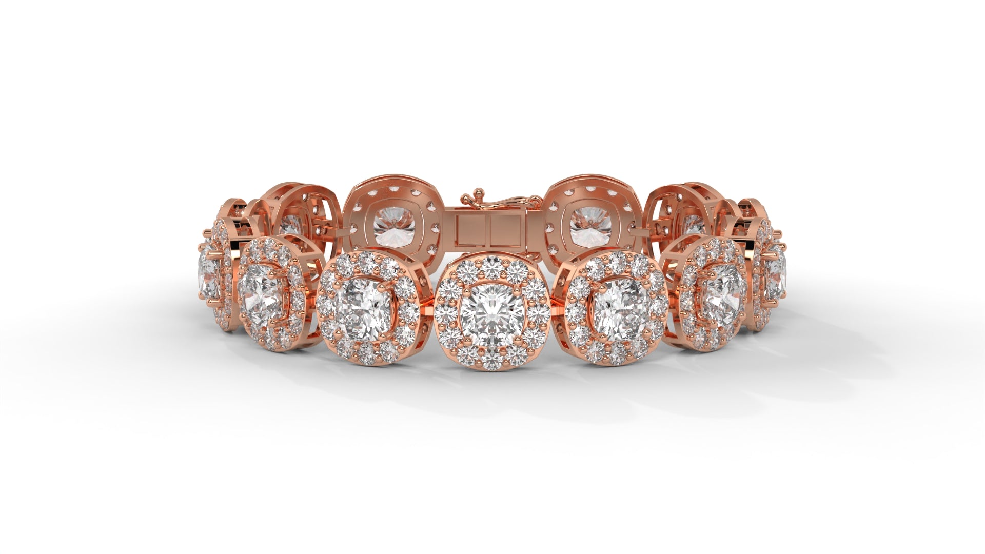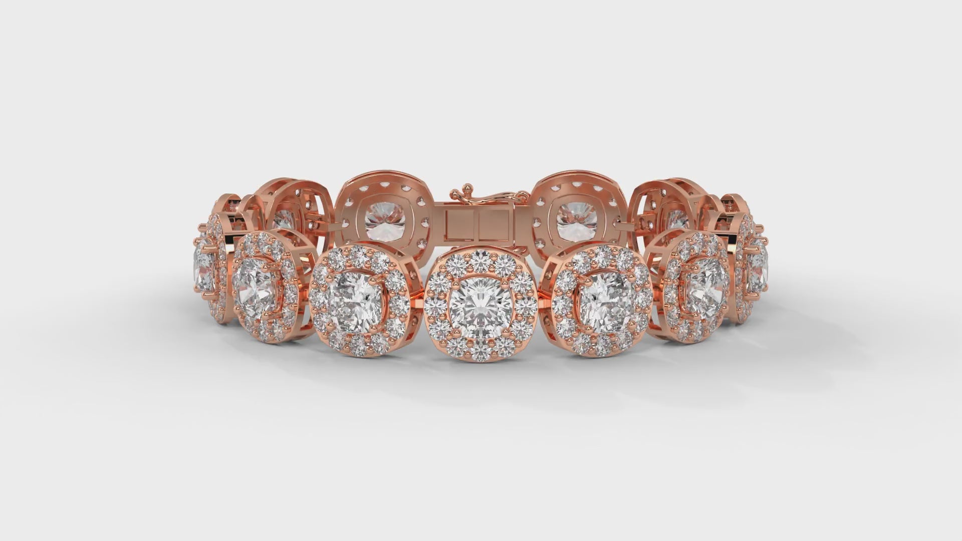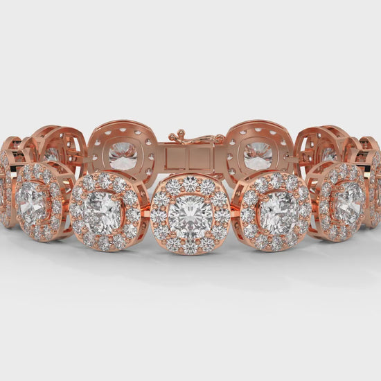 30.26 CTW Diamond Tennis Bracelet in 14K Rose Gold – Cushion and Round Halo Design