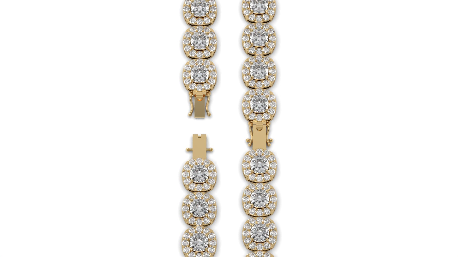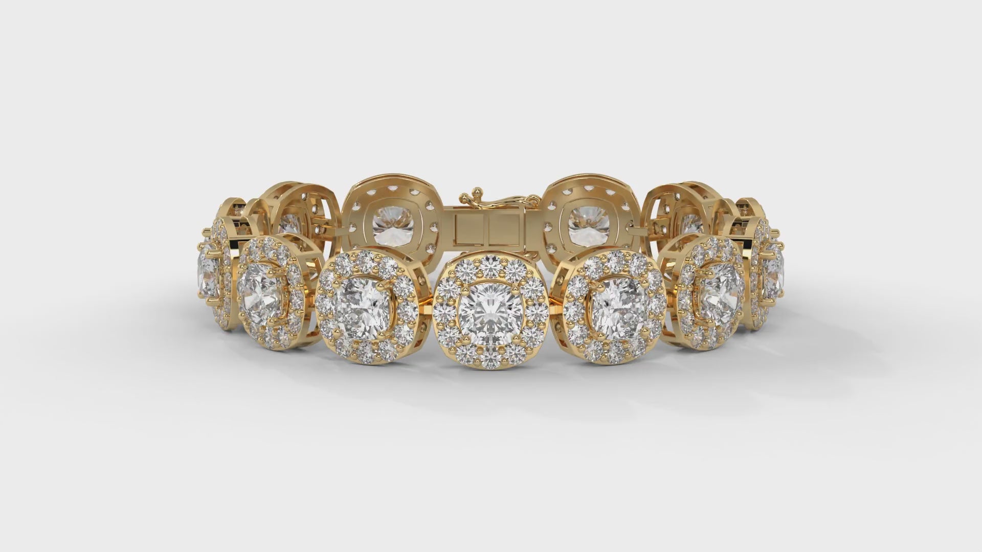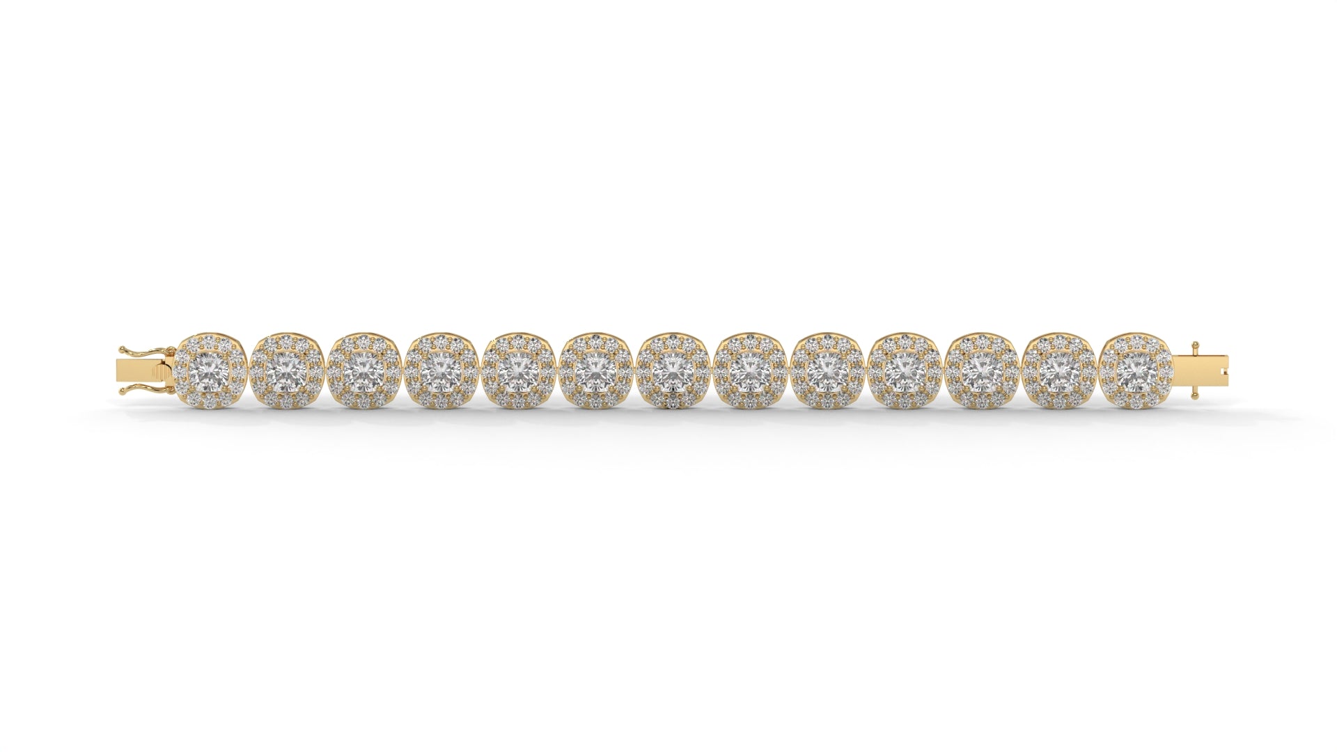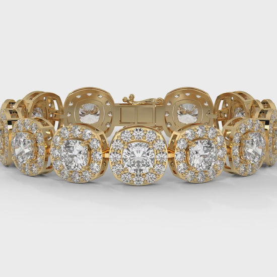30.26 CTW Diamond Tennis Bracelet in 14K Yellow Gold – Cushion and Round Halo Design