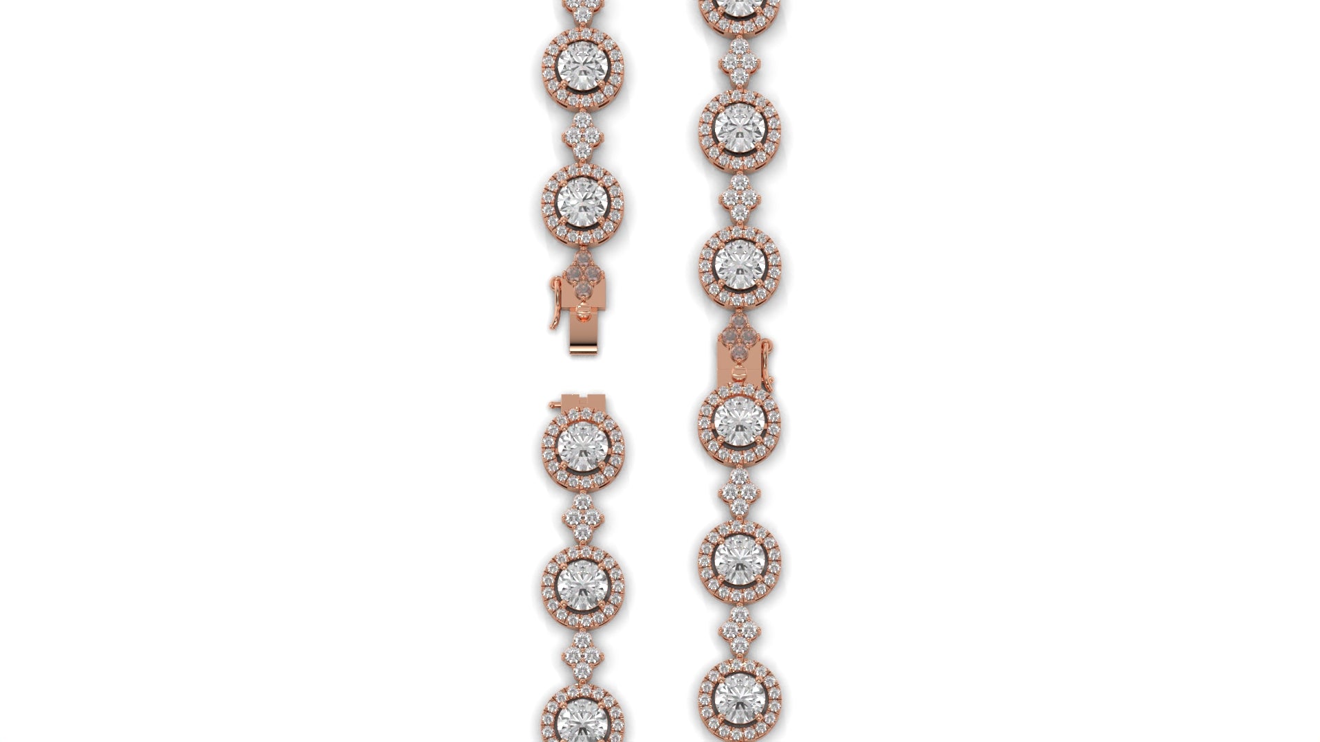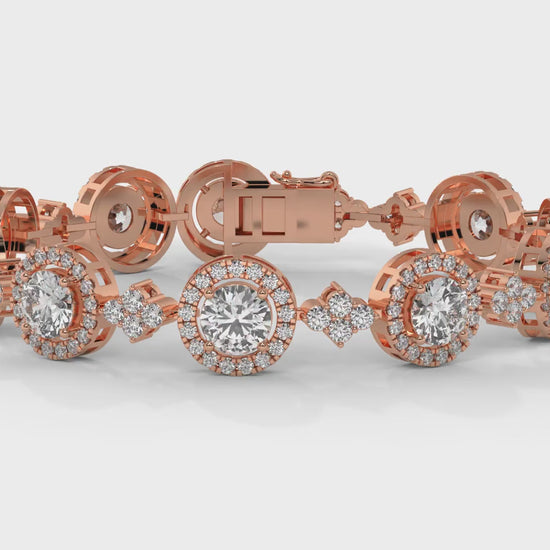 This 4.18 carat total weight diamond bracelet features a striking halo link design, where each center stone is surrounded by a circle of smaller diamonds for maximum brilliance. Set in 14K rose gold, the alternating halo and diamond accents create a sophisticated rhythm of sparkle, making this bracelet a statement piece for elegant evenings or everyday luxury.