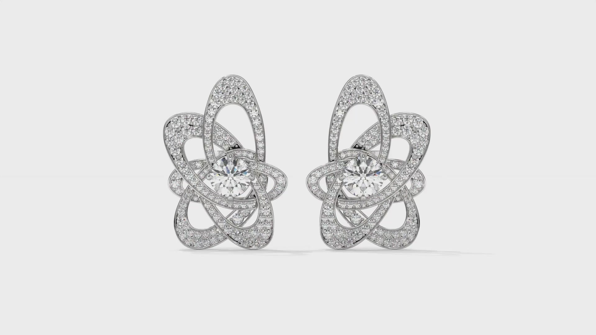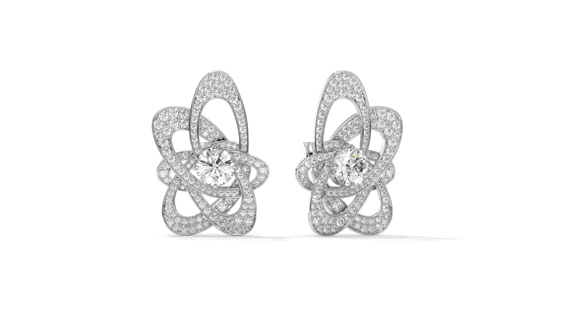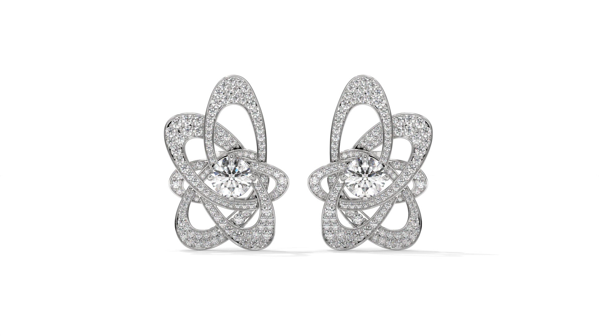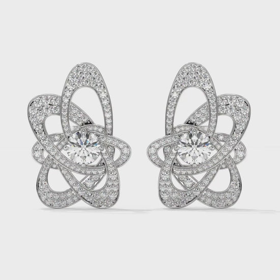 Featuring a total weight of 4.31 carats, these 14K white gold stud earrings showcase brilliant round center diamonds highlighted by an intricate designer pattern encrusted with pavé-set accent stones. The artistic, interlaced design adds depth and sparkle, making them a bold yet elegant statement piece for special occasions or luxury everyday wear.