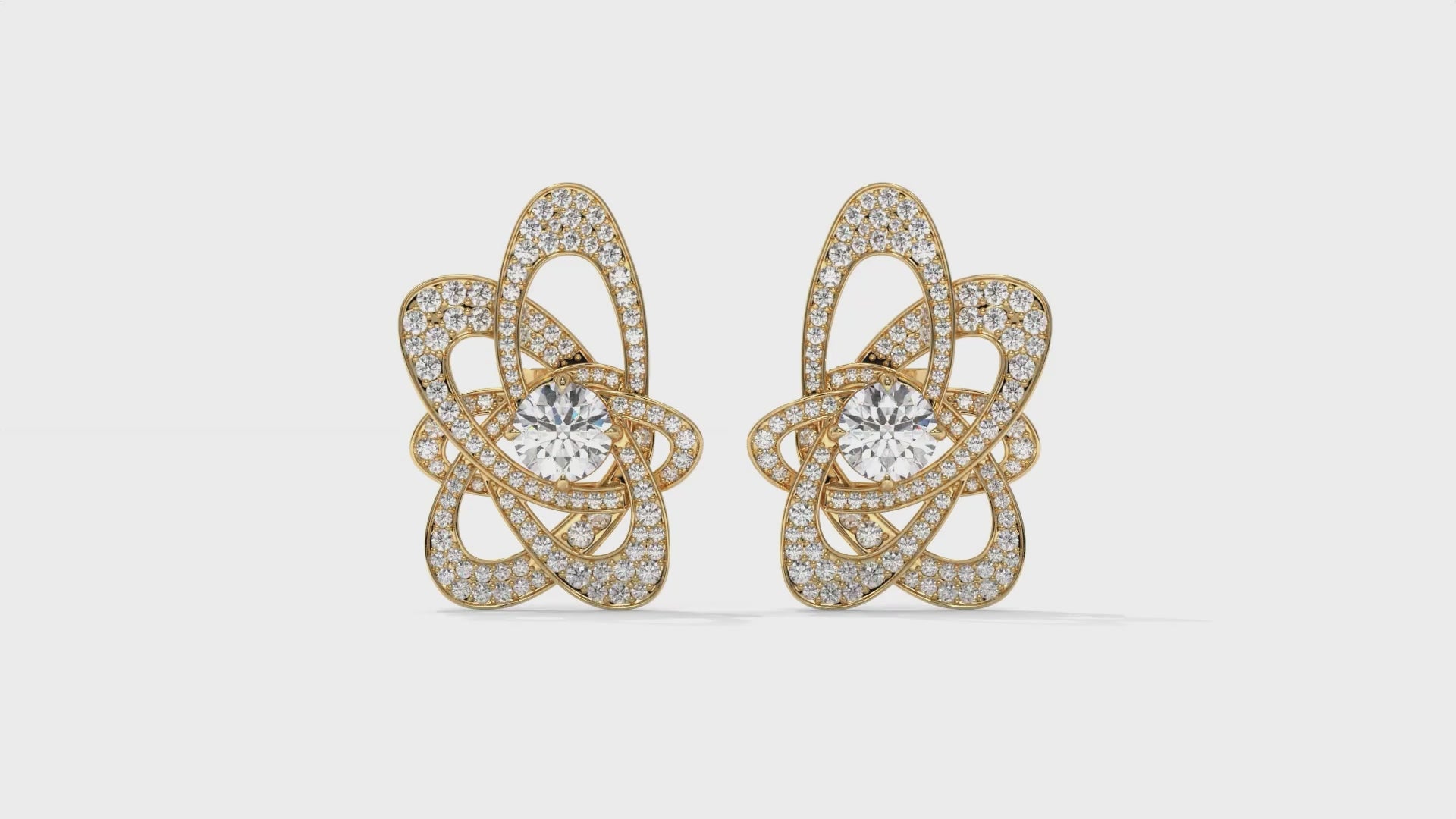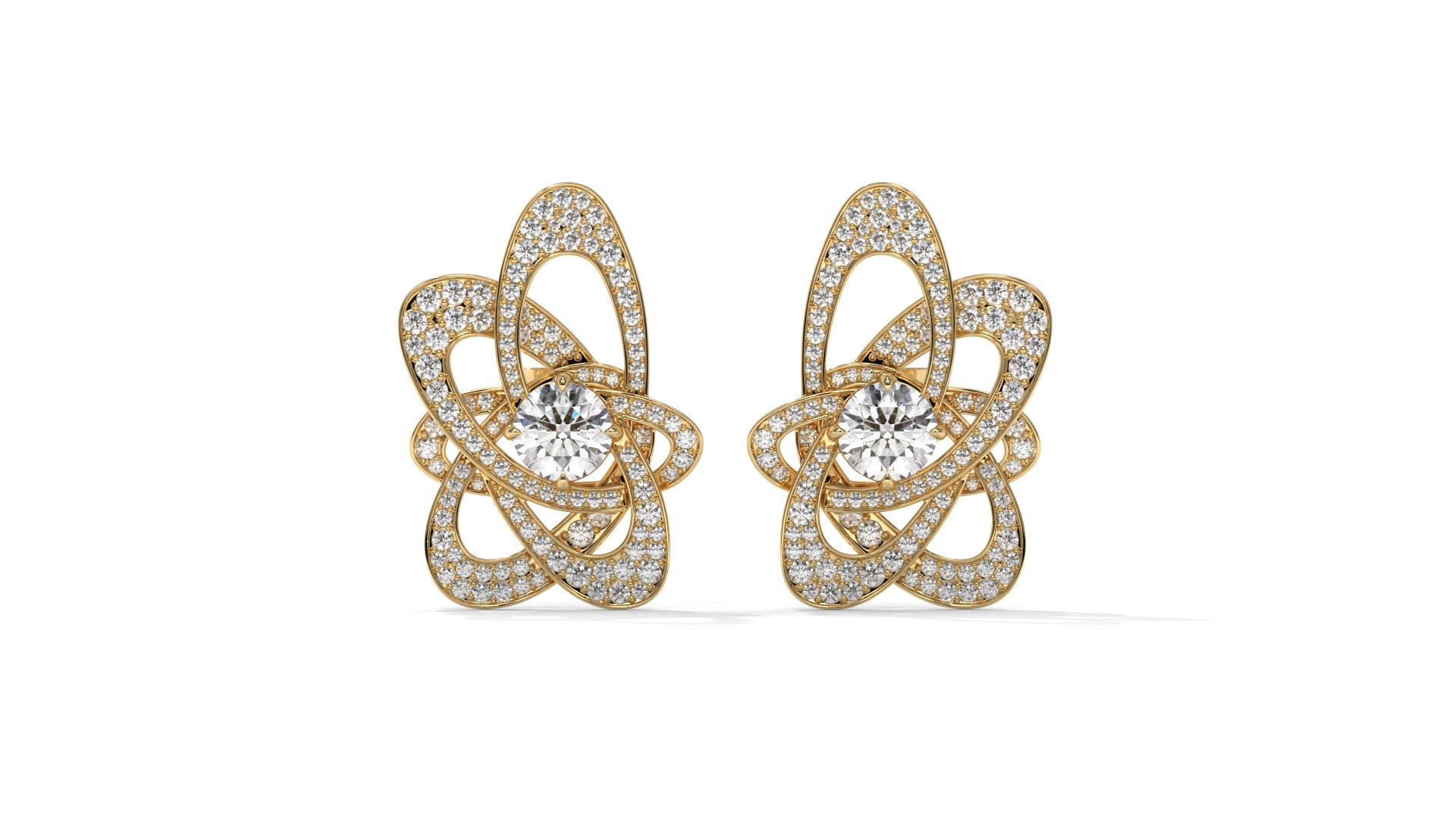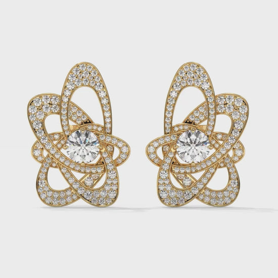 Featuring a total weight of 4.31 carats, these 14K yellow gold stud earrings showcase brilliant round center diamonds highlighted by an intricate designer pattern encrusted with pavé-set accent stones. The artistic, interlaced design adds depth and sparkle, making them a bold yet elegant statement piece for special occasions or luxury everyday wear.