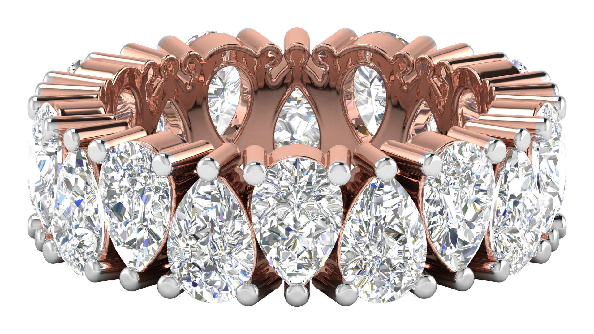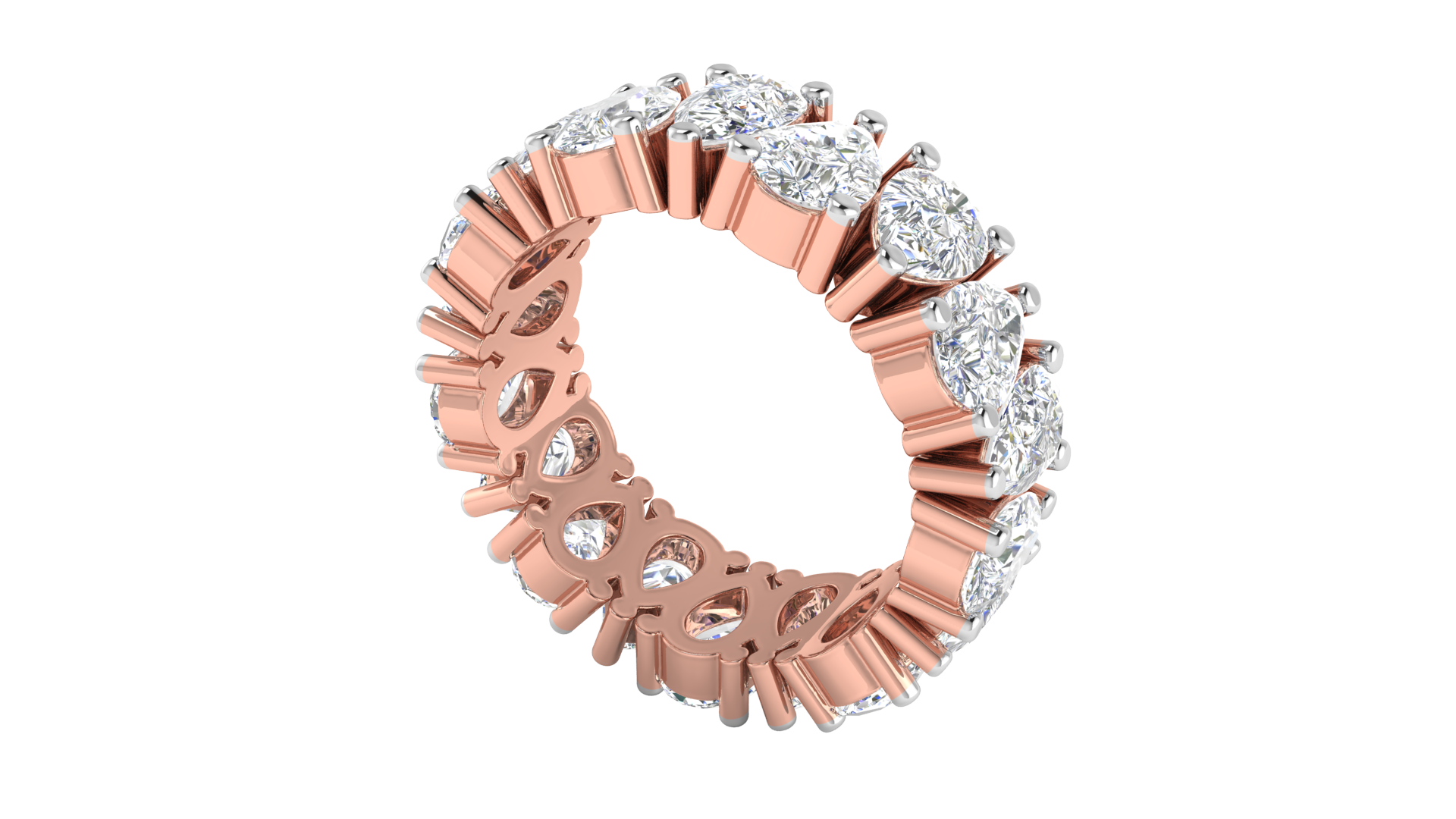 This extraordinary eternity band features 4.40 carats of beautifully cut pear-shaped diamonds, elegantly set in a luxurious 14k Rose gold. Each diamond is carefully prong-set, forming a continuous row of shimmering brilliance that exudes sophistication and elegance. The unique pear-cut diamonds, with their teardrop shape, create a romantic and timeless appeal. Perfect for commemorating special milestones, such as weddings or anniversaries, this ring is a stunning symbol of everlasting love and commitment. A true masterpiece for any fine jewelry collection.
