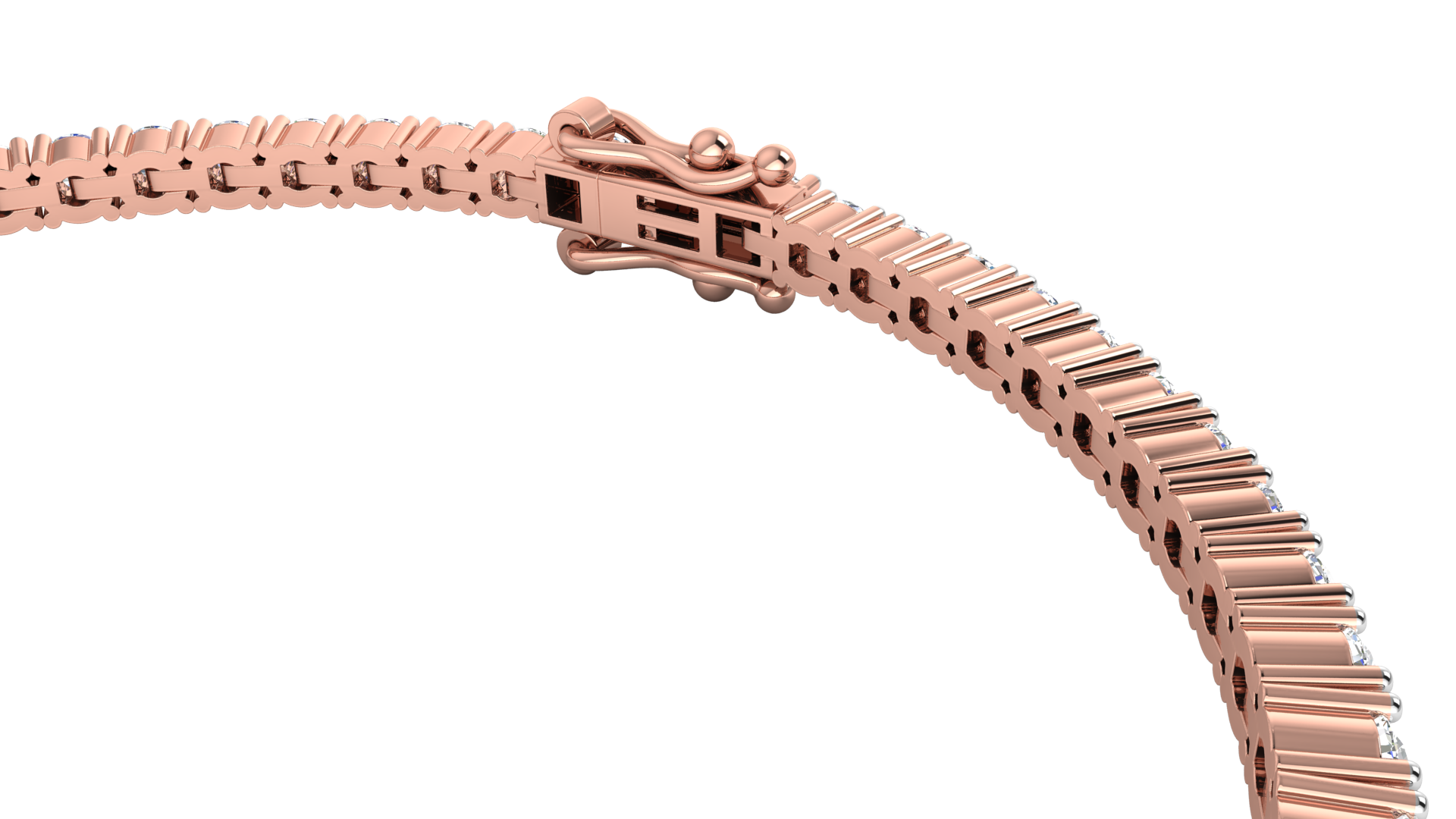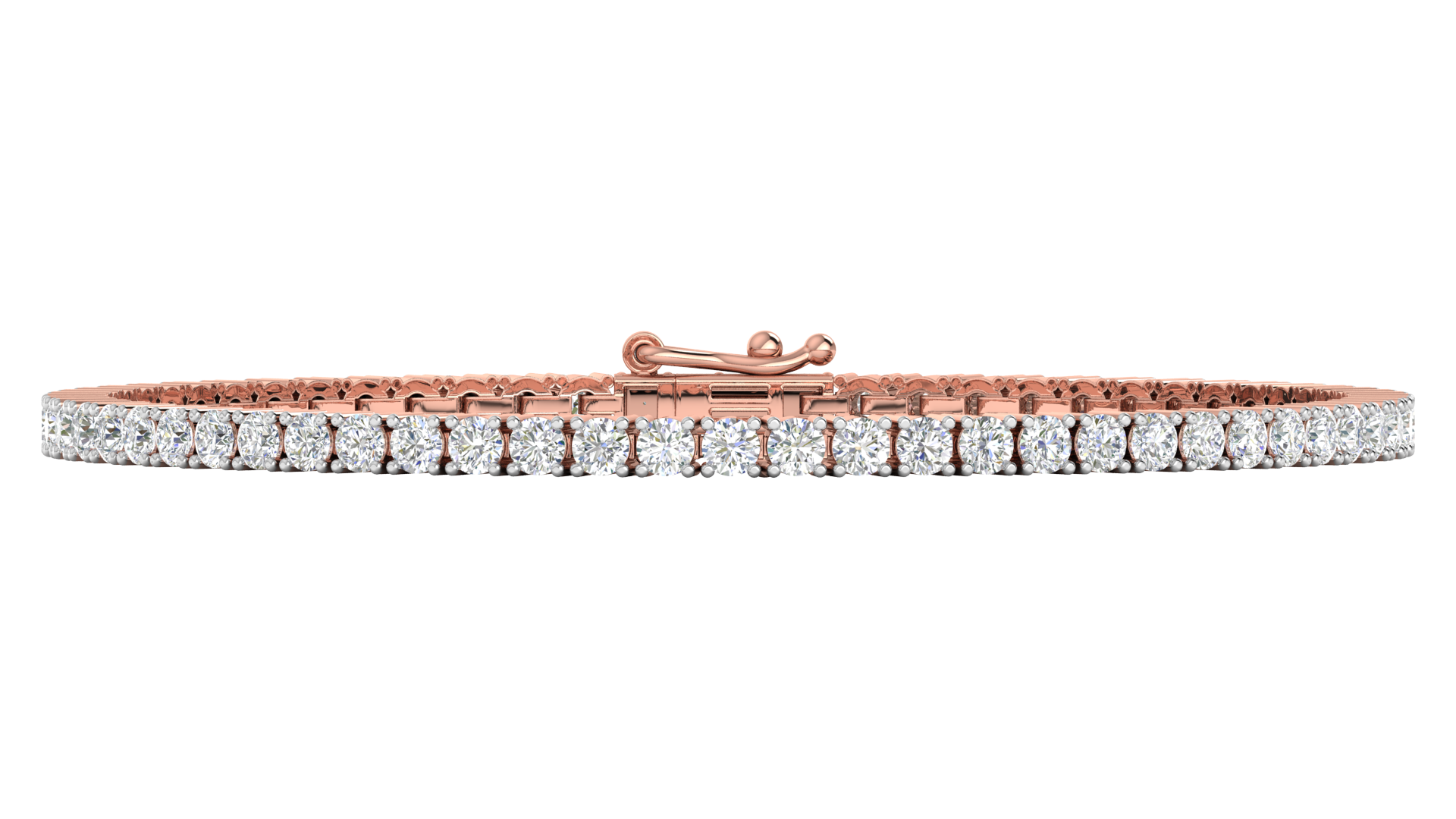 This tennis bracelet, crafted from 14K rose gold, features a sleek and elegant design adorned with round brilliant-cut diamonds. Each stone is carefully set in prongs to enhance its sparkle and brilliance, while VS clarity and F color add to the bracelet's luxurious appeal. The secure clasp ensures that it stays firmly in place, making it a perfect accessory for any occasion.