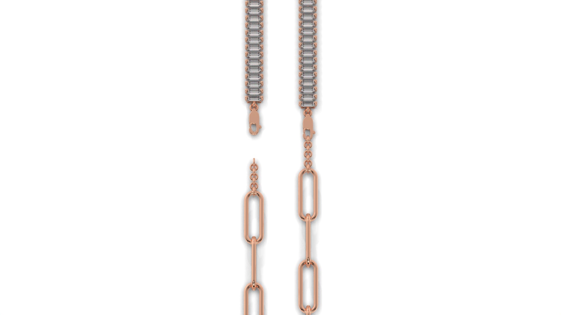 This 6.44 carat total weight diamond bracelet is crafted in 14K rose gold and features rows of straight baguette-cut diamonds for a bold, contemporary look. The sleek diamond line is accented with oversized polished gold links, creating a stylish balance of brilliance and modern design. Perfect for making a statement, this baguette diamond bracelet is a versatile piece that transitions effortlessly from day to evening wear.