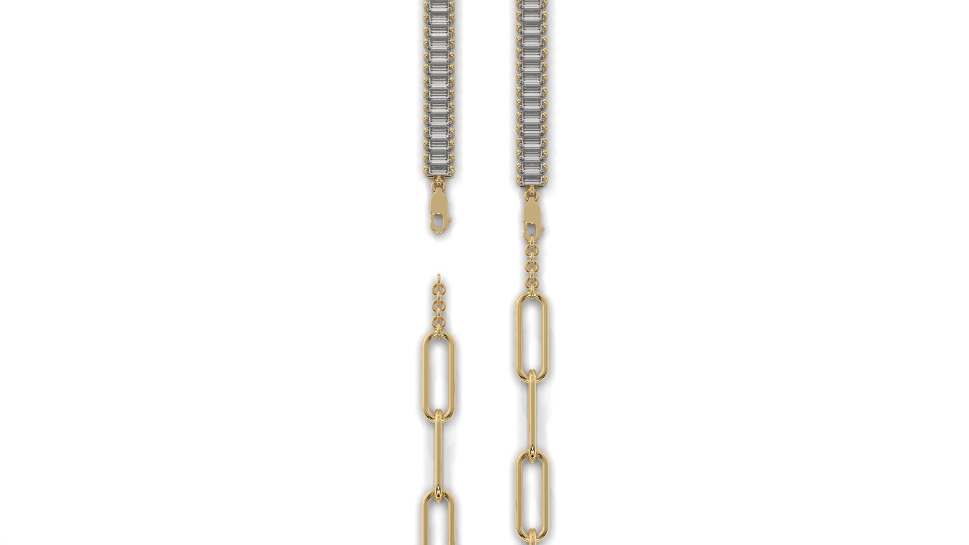 This 6.44 carat total weight diamond bracelet is crafted in 14K yellow gold and features rows of straight baguette-cut diamonds for a bold, contemporary look. The sleek diamond line is accented with oversized polished gold links, creating a stylish balance of brilliance and modern design. Perfect for making a statement, this baguette diamond bracelet is a versatile piece that transitions effortlessly from day to evening wear.
