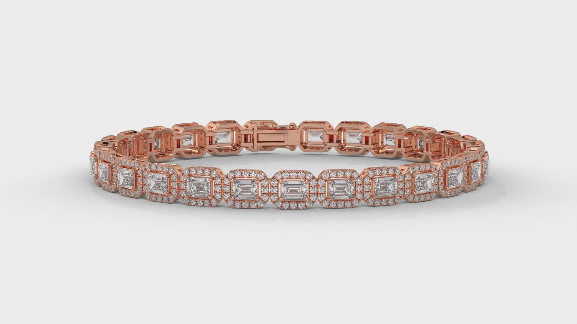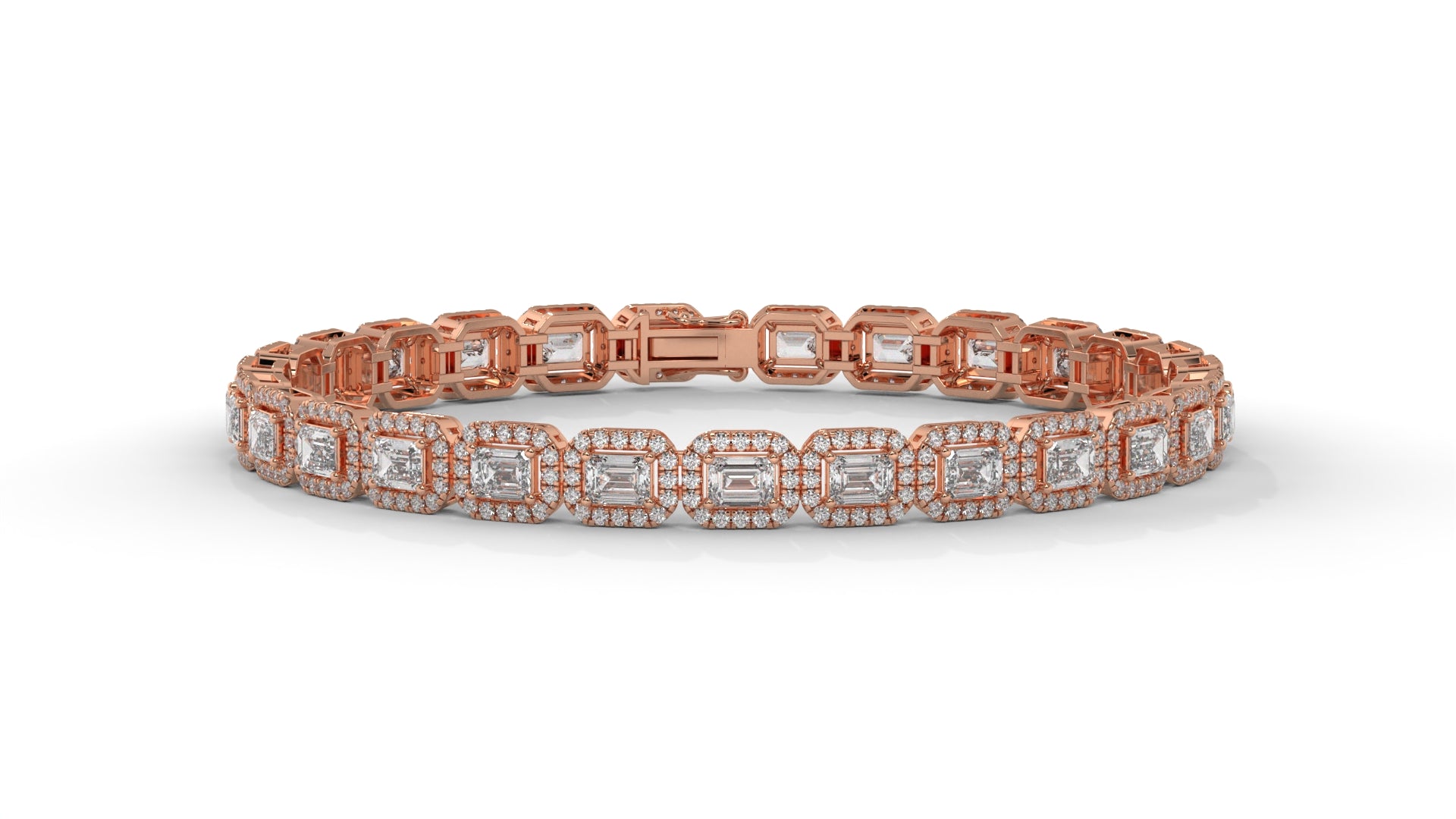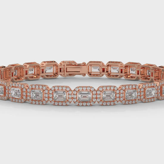 This 7.00 carat total weight diamond bracelet is crafted in 14K rose gold, featuring a bold halo design that pairs emerald-cut diamonds with round brilliant cut diamonds. The combination creates a radiant sparkle and a timeless statement look, perfect for elevating evening wear or celebrating life’s most meaningful moments.