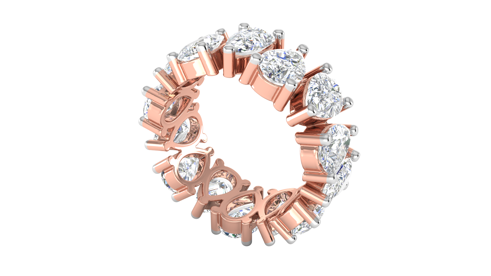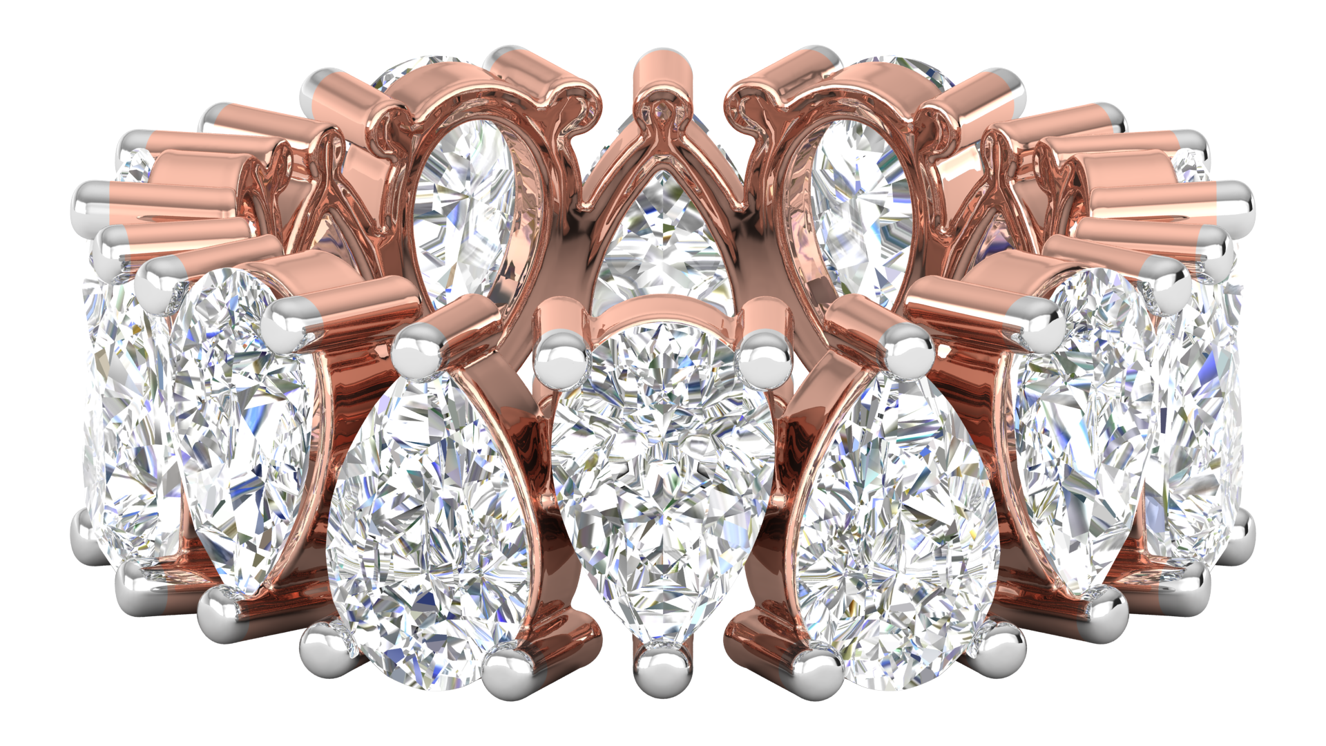 This stunning eternity band showcases 7 carats of exquisite pear-cut diamonds, meticulously set in a luxurious 14k rose gold. Each diamond's unique teardrop shape is elegantly prong-set, forming a seamless circle of brilliance. The intricate craftsmanship highlights the timeless beauty and sophistication of the pear-cut stones, making this ring a perfect symbol of everlasting love and commitment. Whether for weddings, anniversaries, or special milestones, this band is a luxurious addition to any fine jewelry collection.
