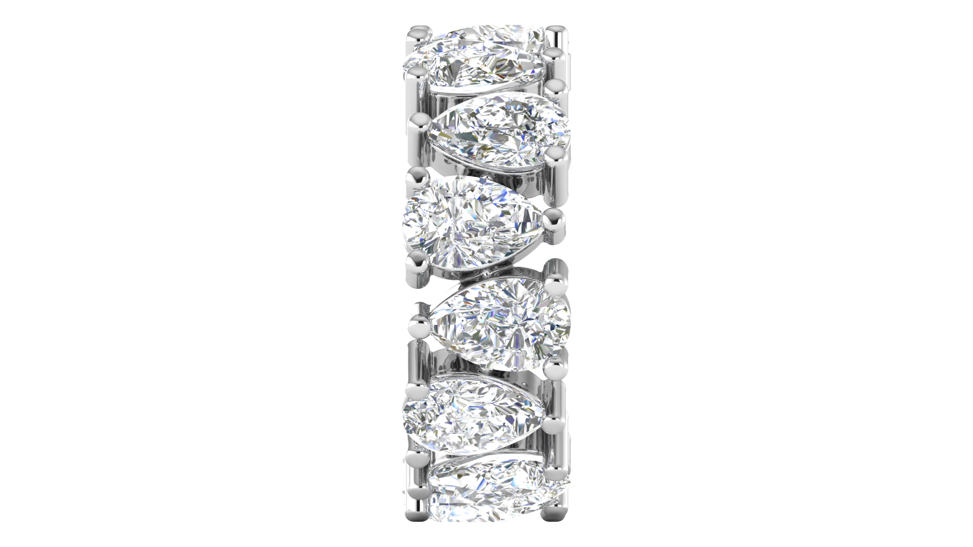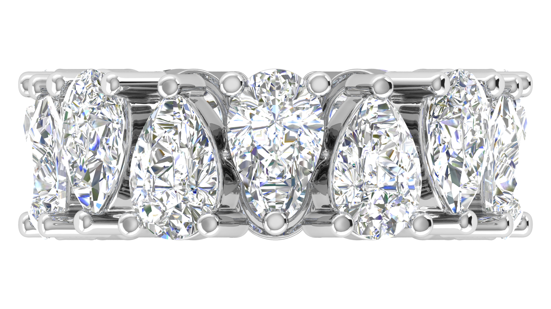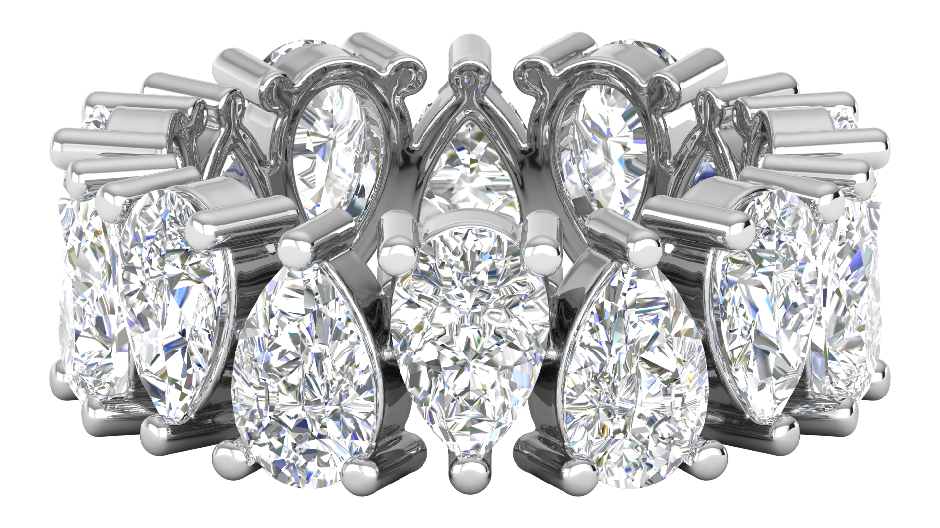 This stunning eternity band showcases 7 carats of exquisite pear-cut diamonds, meticulously set in a luxurious 14k white gold. Each diamond's unique teardrop shape is elegantly prong-set, forming a seamless circle of brilliance. The intricate craftsmanship highlights the timeless beauty and sophistication of the pear-cut stones, making this ring a perfect symbol of everlasting love and commitment. Whether for weddings, anniversaries, or special milestones, this band is a luxurious addition to any fine jewelry collection.