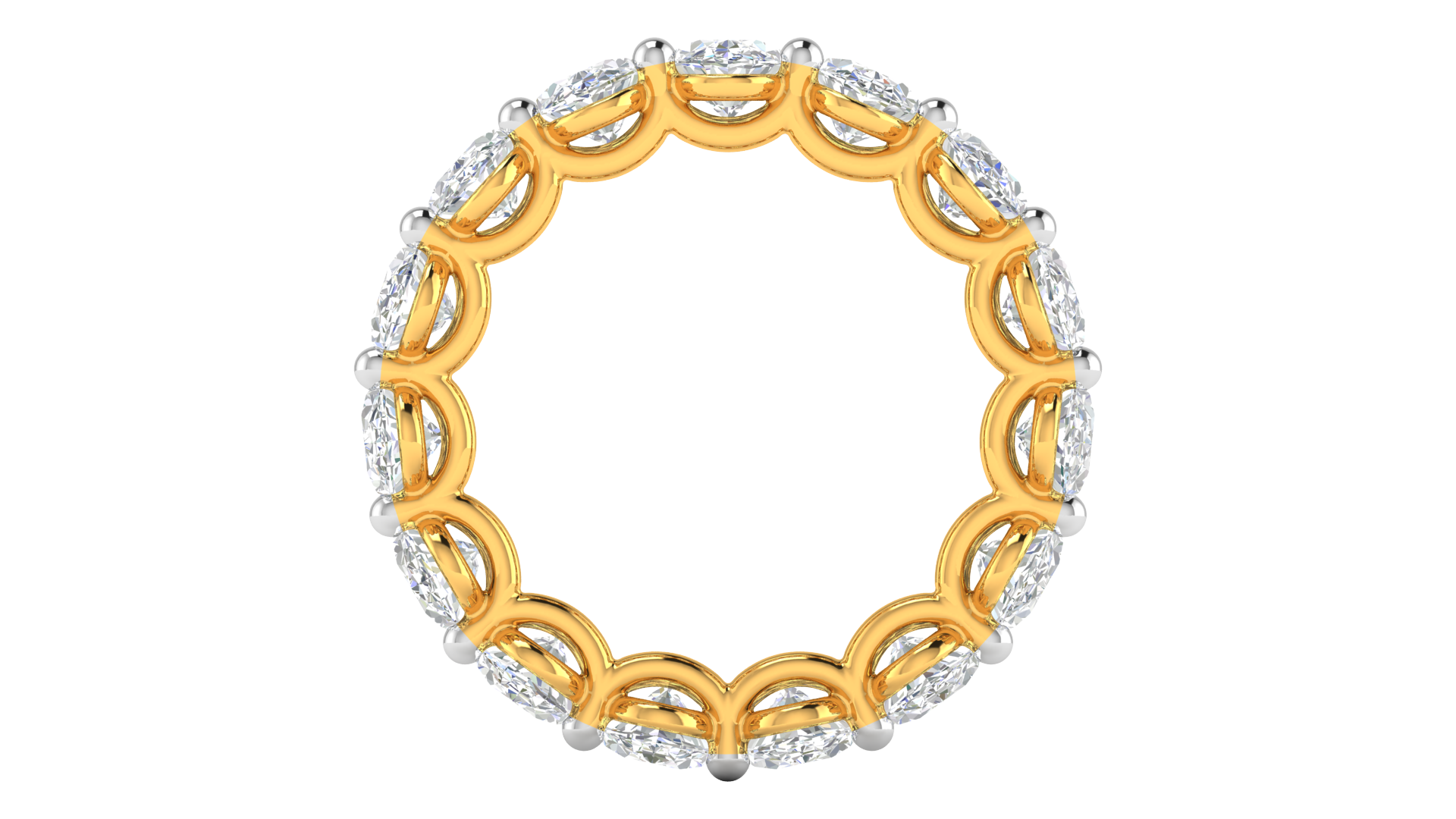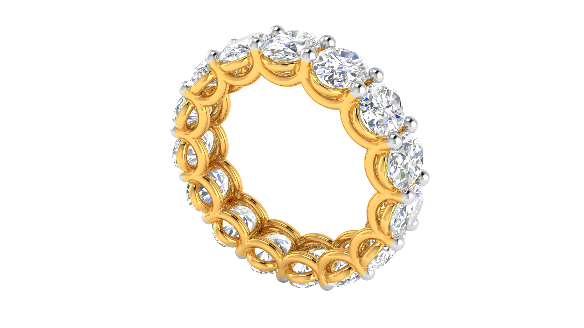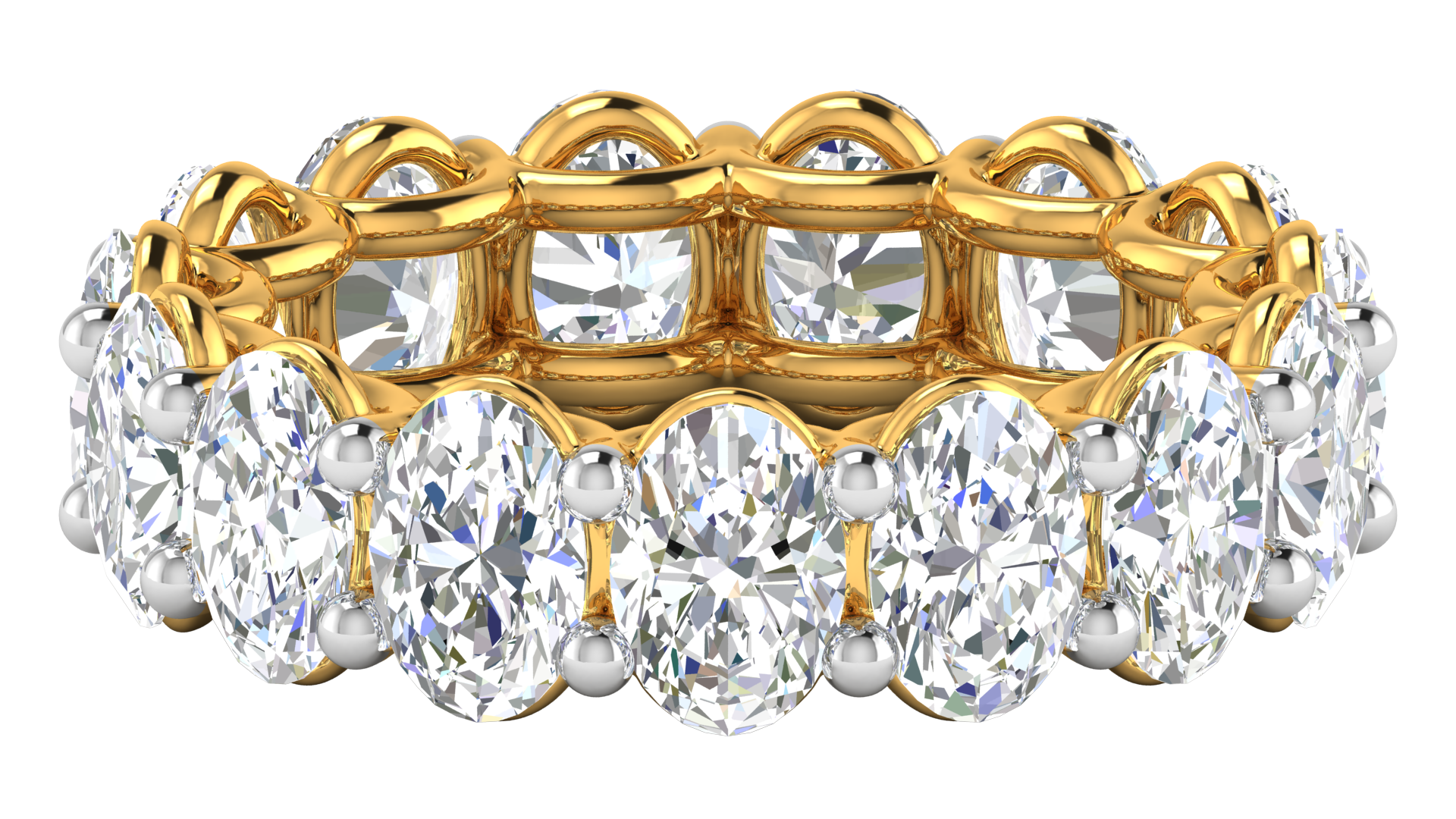 This exquisite eternity band features 7.50 carats of oval-cut diamonds, carefully set in a luxurious 14k yellow gold band. The intricate prong setting creates a seamless circle of brilliance, enhancing the natural sparkle and elegance of each stone. The flowing design provides a perfect blend of modern sophistication and timeless beauty. Ideal for marking special occasions such as weddings, anniversaries, or as a statement of everlasting love, this ring is a true celebration of style and commitment.
