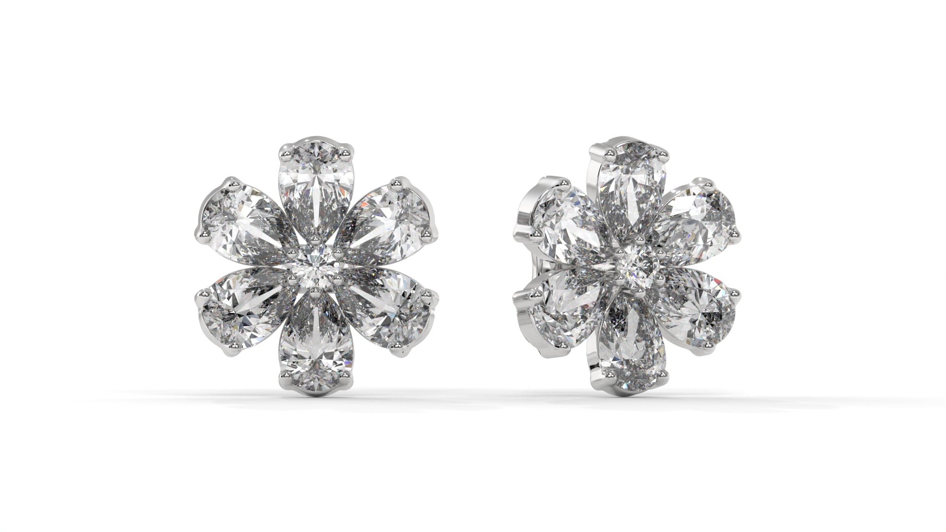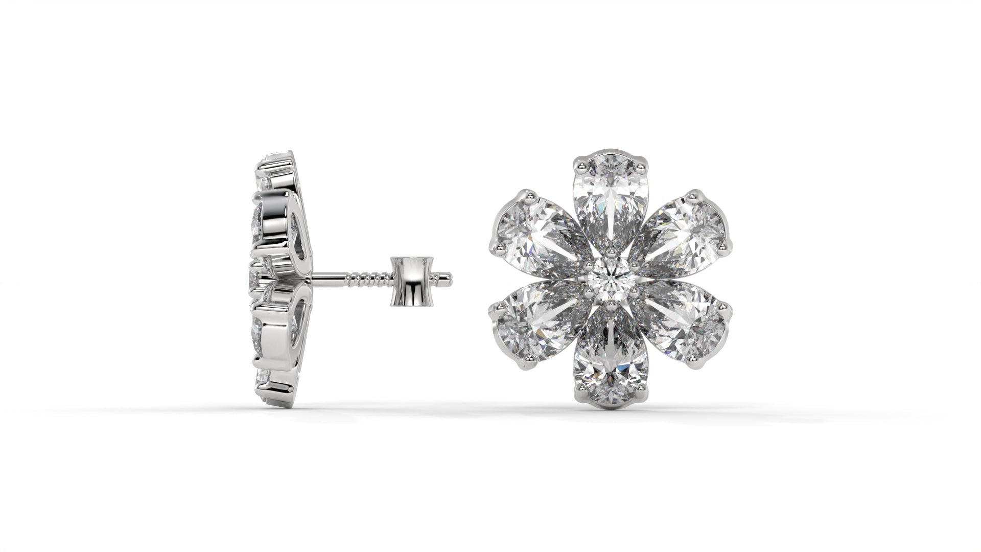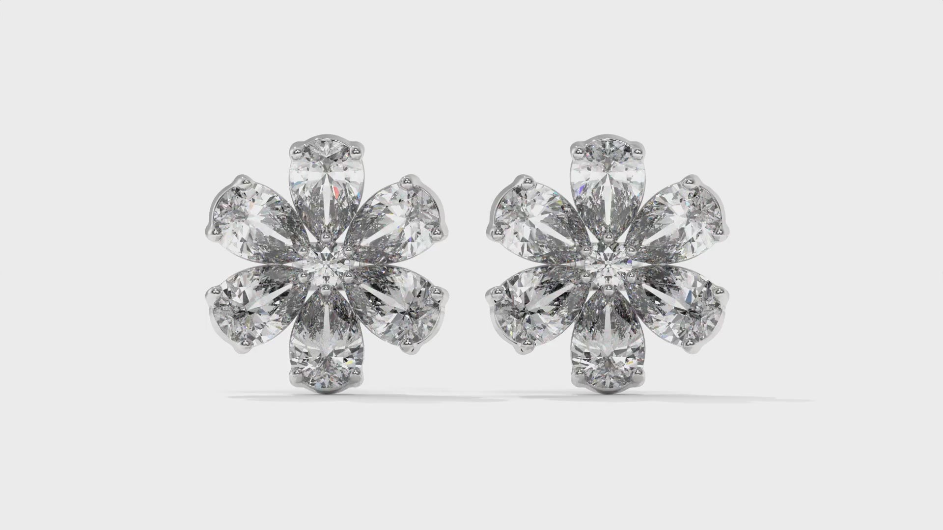 Featuring a total weight of 8.14 carats, these exquisite 14K white gold stud earrings showcase 8 CTW of pear-shaped diamonds arranged in a radiant floral cluster, accented by 0.14 CTW of round-cut diamonds for added brilliance. The elegant design combines the bold sparkle of pear shapes with the delicate fire of round diamonds, making these studs a true statement piece for special occasions or luxury everyday wear.